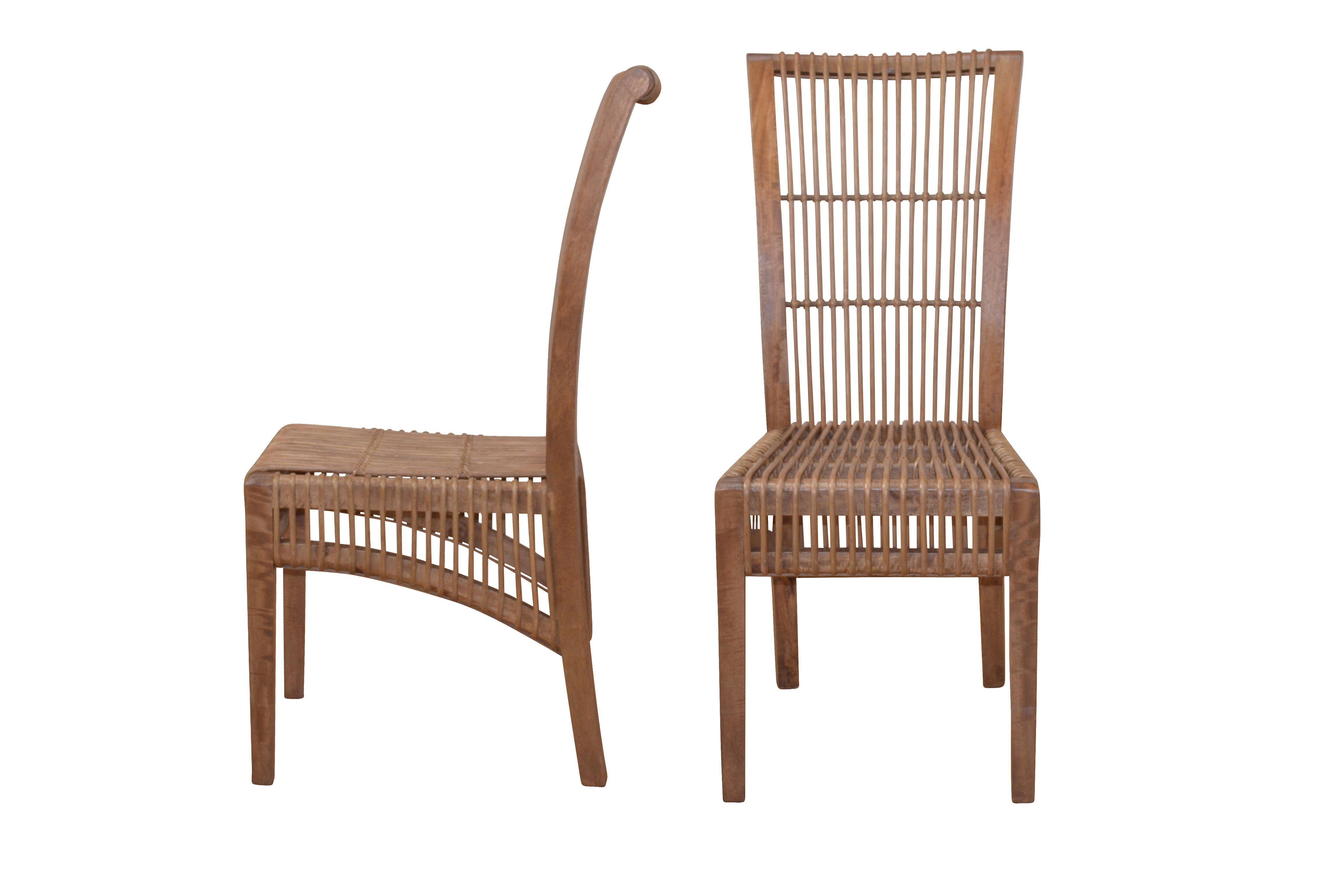 Moderner Rattanstuhl (2Stück) mit einem Gestell aus Massivholz, Mangoholz, braun gebeizt und lackiert. Sitz und Rücken sind mit Rattangeflecht, handgeflochten, braun gebeizt und lackiert. Wahlweise auch mit passendem Sitzkissen lieferbar. Sitzkissen mit einem ca. 5 cm starken Schaumstoffkern und bezogen mit einem cremefarbenen Stoffbezug (65% Baumwolle/35% Polyester). Kissen mit praktischen Befestigungsbändern. Stühle werden montiert angeliefert. Maße ca. cm: (B/H/T) 45/105/59. Sitzhöhe ca. 47,5 cm ohne Kissen. Rückenlehnenhöhe ca. 59,5 cm.