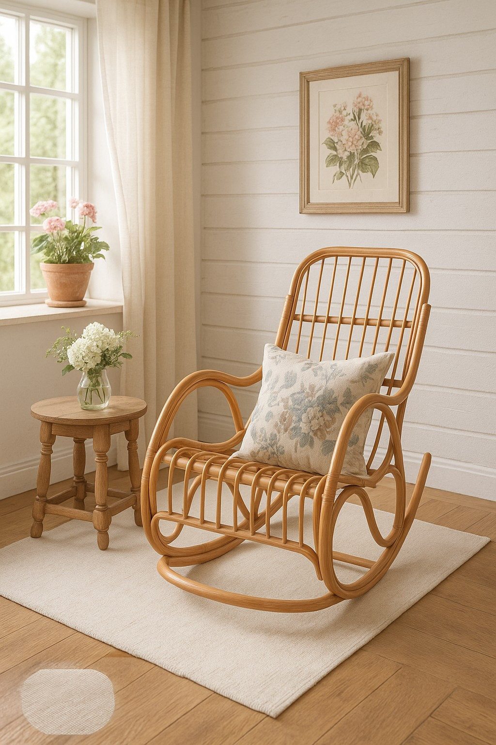 Genießen Sie entspannte Stunden mit diesem hochwertigen Schaukelstuhl aus Rattan, der in traditioneller Handarbeit gefertigt wird. Das stabile Gestell besteht komplett aus natürlichem Rattanrohr, liebevoll handgeflochten und in zwei stilvollen Ausführungen erhältlich: honigfarben oder braun gebeizt & lackiert.