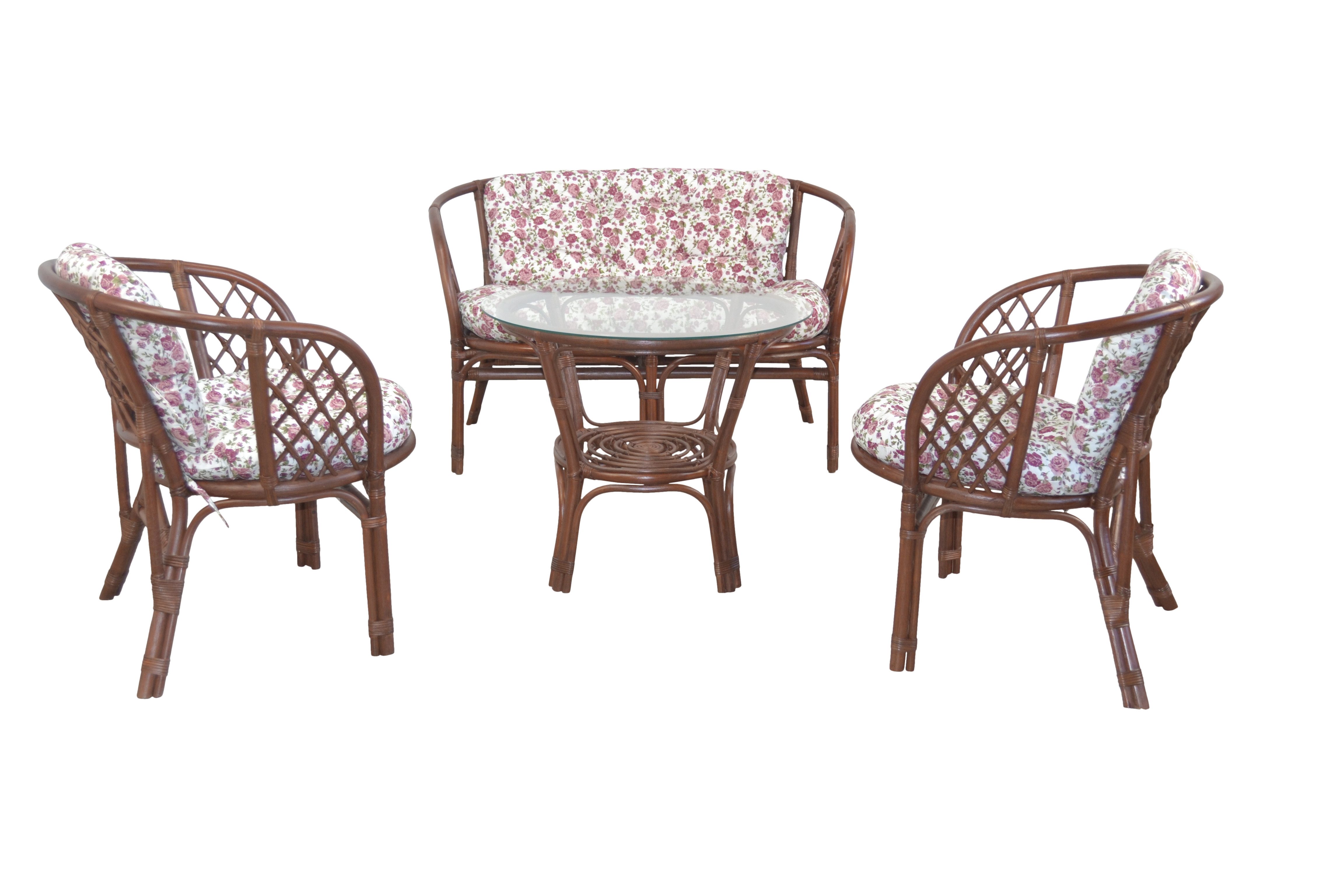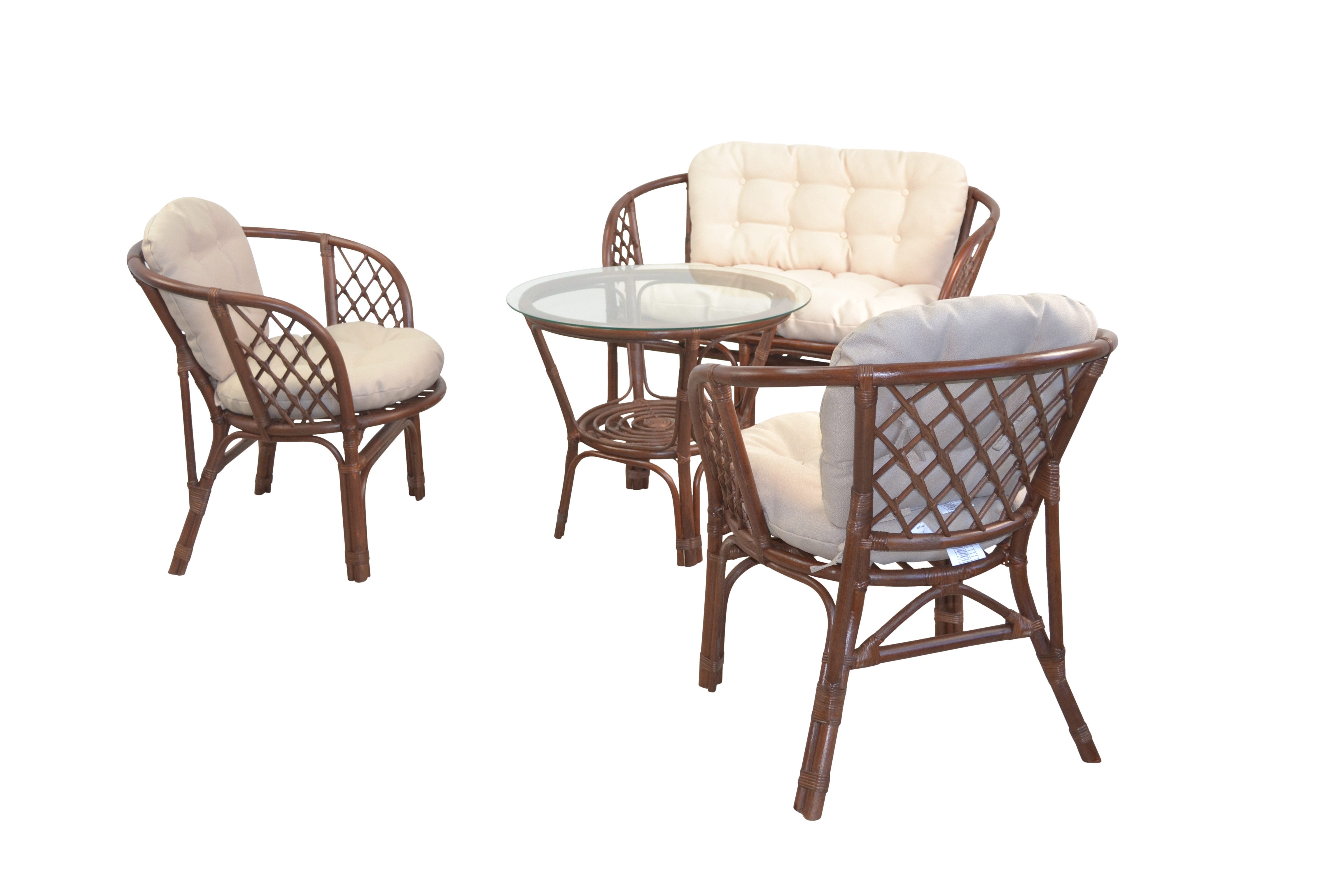 Lieferumfang | 2 Sessel, 1 Bank jeweils mit Kissenauflagen. 1 Tisch mit Glasplatte |