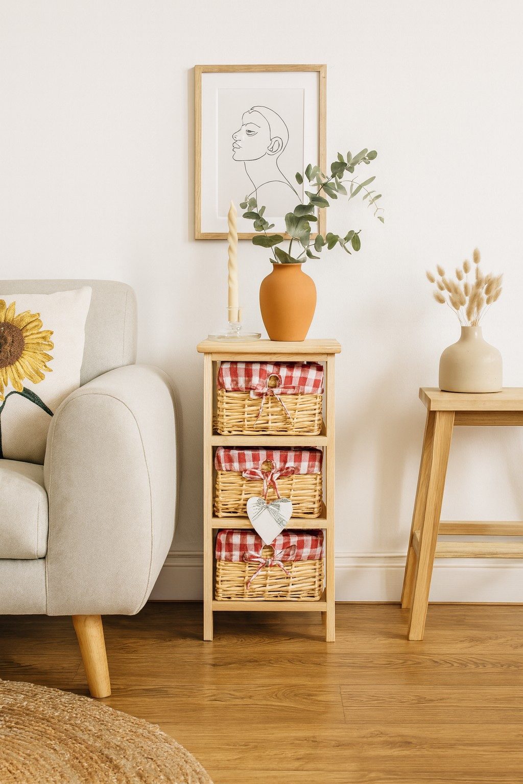 Die Weidenkörbe sind handgeflochten, naturfarben gebeizt und lackiert. Innen überzeugt ein rot karierter Stoffbezug aus 100 % Polyester, der für einen gemütlichen Landhaus-Look sorgt.
