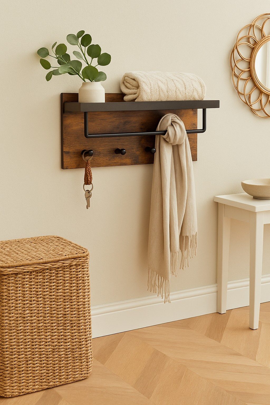 Lieferumfang | 1x Wandgarderobe, Aufbauanleitung, Montagematerial, Ablageboden, Kleiderstange, 3 Haken |
