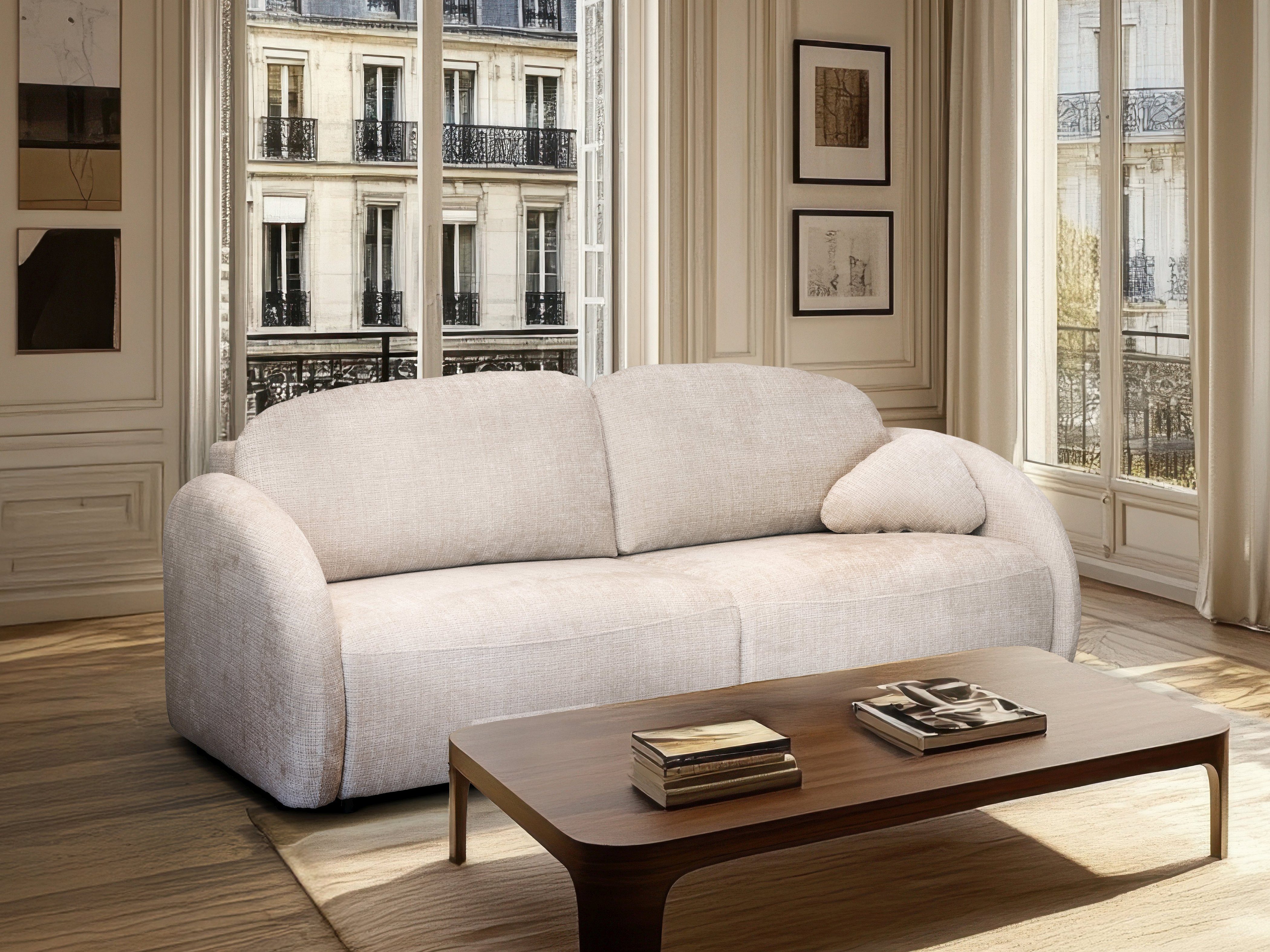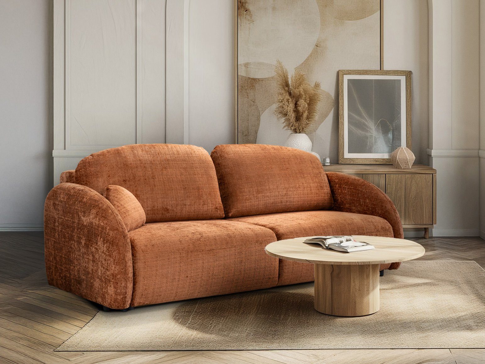 Das Schlafsofa Sirio vereint modernes Design mit praktischer Funktionalität. Die gerundeten Armlehnen sorgen für einen sanften Abschluss und verleihen dem Möbel eine einladende Form. Auch die Rückenkissen sind oben leicht gewölbt und unterstreichen die harmonische Linienführung. Ein kleines Zierkissen in etwa dreieckiger Form ergänzt das Gesamtbild dekorativ. Als Bettsofa bietet Sirio eine großzügige Liegefläche von 200 × 150 cm, ideal für Gäste oder den täglichen Gebrauch. Die integrierte Schlaffunktion lässt sich leicht ausklappen und verwandelt das Sofa im Handumdrehen in ein Bett. Ein Bettkasten bietet zusätzlichen Stauraum für Decken und Kissen.