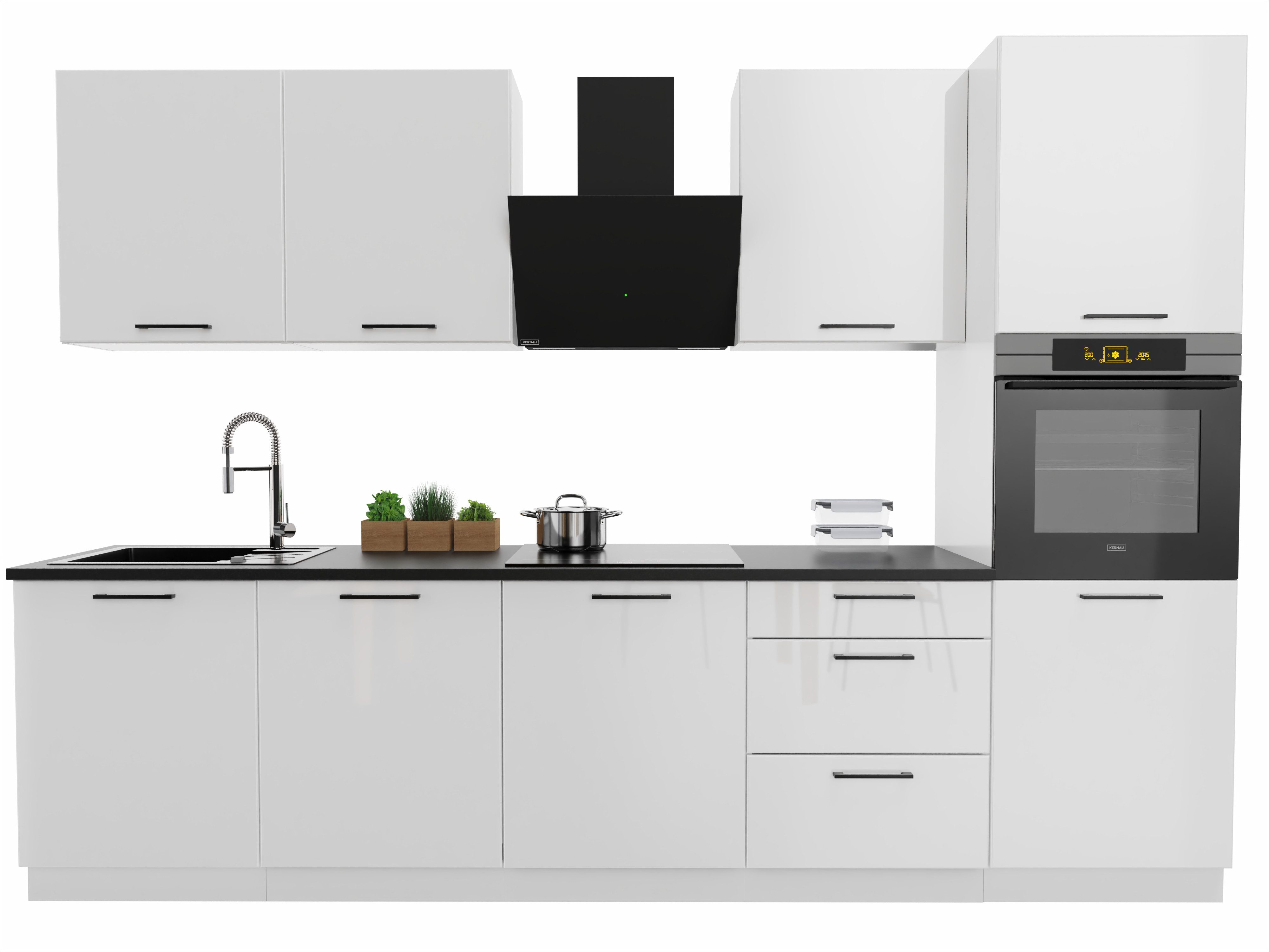 Hier wird eine Küchenzeile mit 300 cm Gesamtbreite bestehend aus 8 Schränken angeboten. Die Fronten sind in wahlweise in Weiß Hochglanz oder Beige matt gehalten und für einen kontrastreichen Look mit Metallgriffen in mattem Schwarz ausgestattet.