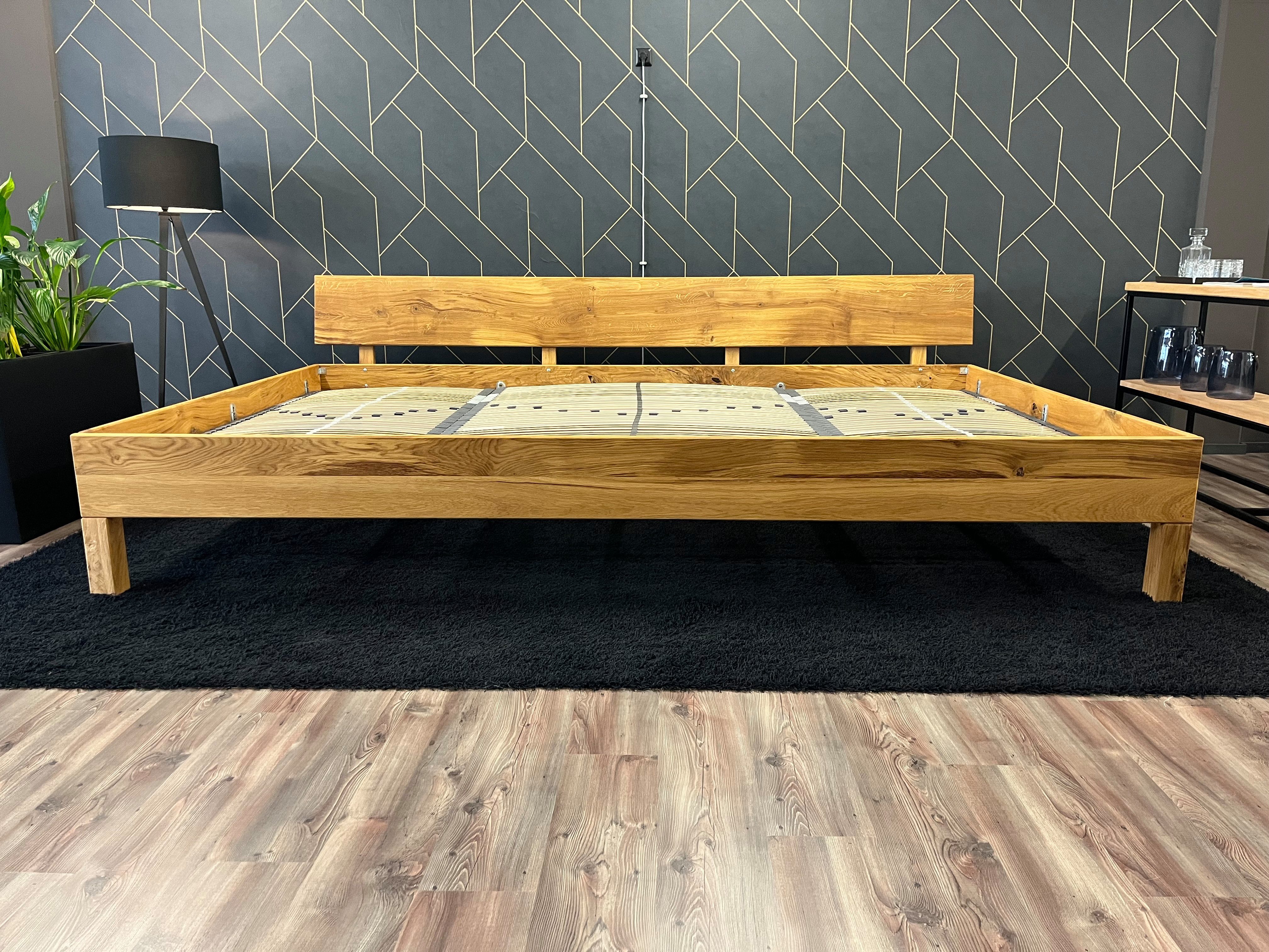 Bei unserem Modell Family ist das komplette Bett aus 2,6cm starker und vollmassiver Eiche gefertigt. Das Kopfteil ist 1-teilig mit einem geraden Schnitt und der Rahmen steht auf vier massiven Blockfüßen. Diese lassen das Bett optisch leicht und elegant wirken. Beim Rahmen gehen wir mit dem aktuellen Trend und fertigen diesen in einer komfortablen Gesamthöhe von 50cm an.