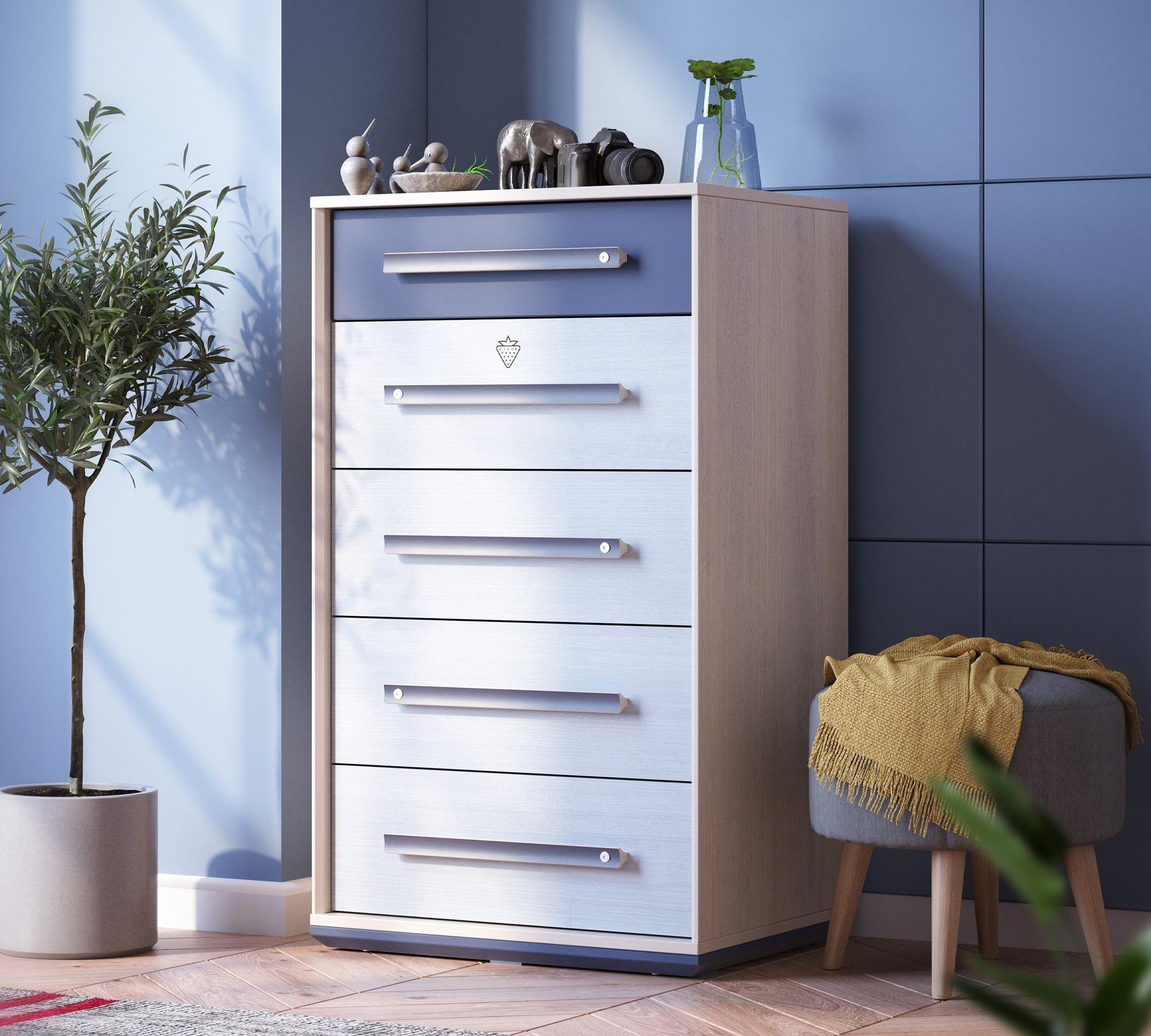 Kinderzimmer-Kommode aus der Serie "Trio" von Cilek hat 5 Schubladen und bietet ausreichend Aufbewahrungsmöglichkeiten für Kleidung und Accesoires. Obere Schublade hat ein Fachteiler damit alles seinen Platz hat.