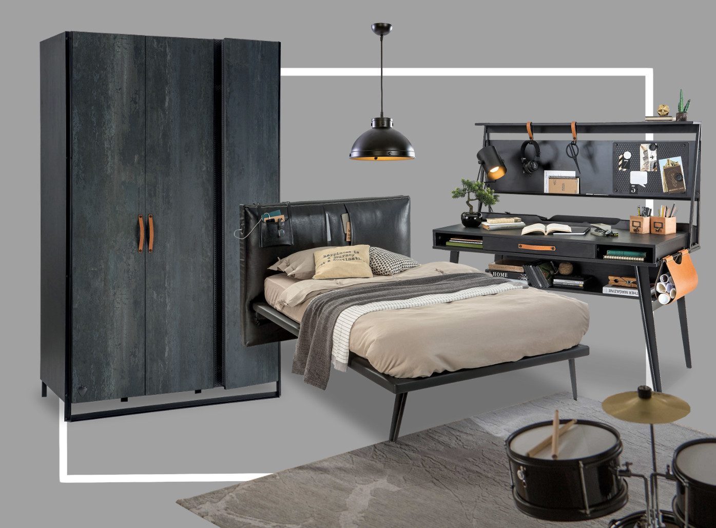 Set beinhaltet | 1 x Dark Metal Kleiderschrank, 1 x Dark Metal Bett, 1 x Dark Metal Schreibtisch, 1 x Dark Metal Tisch-Aufsatz |