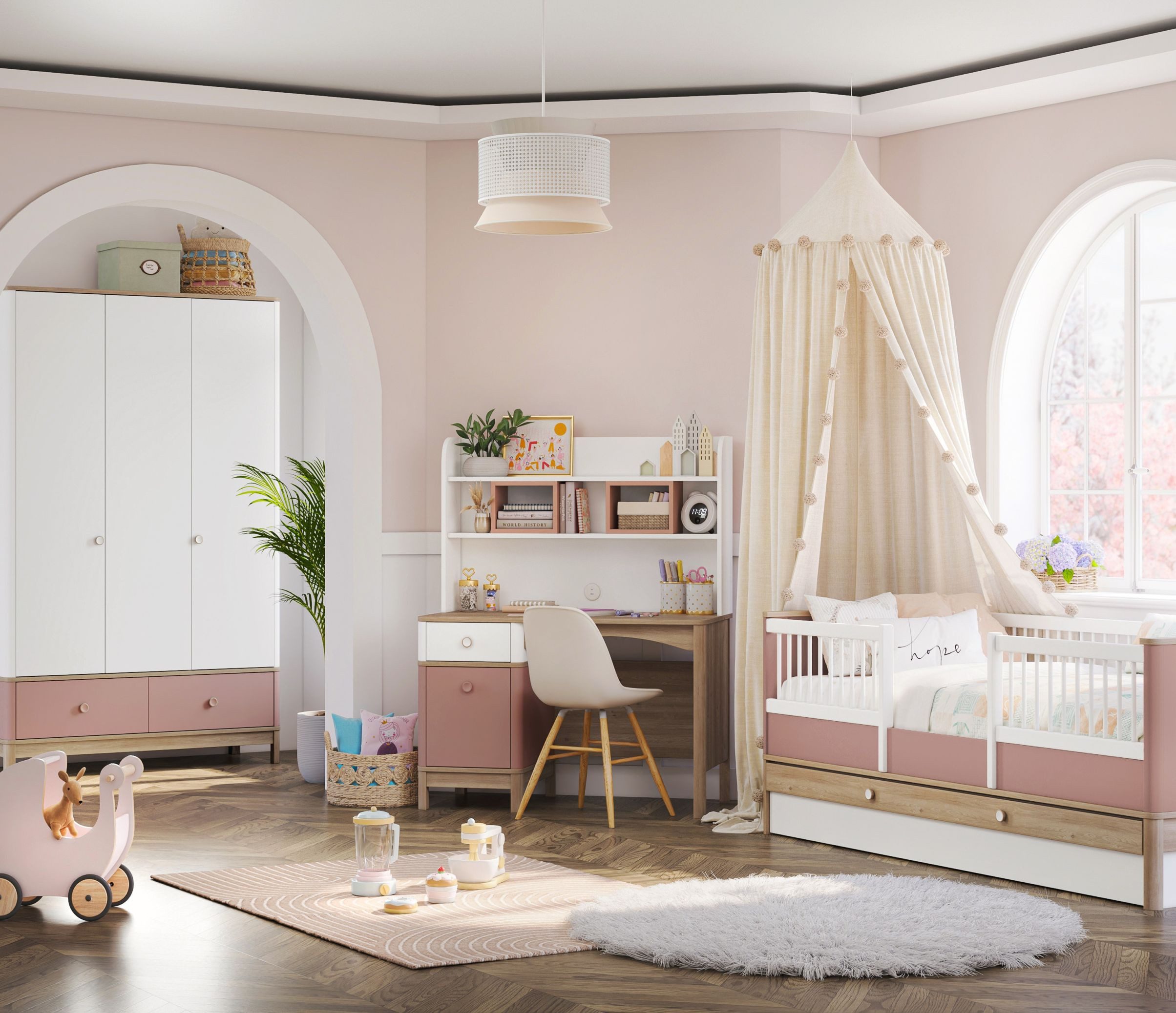 Verwandeln Sie das Kinderzimmer in eine stilvolle und funktionale Wohlfühloase mit dem 4-teiligen Kinderzimmer-Set Bono Pink von Newjoy. Dieses sorgfältig zusammengestellte Set bietet alles, was das Herz begehrt: ein vielseitiges Bett, einen geräumigen Kleiderschrank, einen praktischen Schreibtisch und ein passendes Wandregal. Die harmonische Farbkombination aus Weiß, Pink und Naturfarben schafft eine freundliche und einladende Atmosphäre, in der sich Ihr Kind rundum wohlfühlen wird.