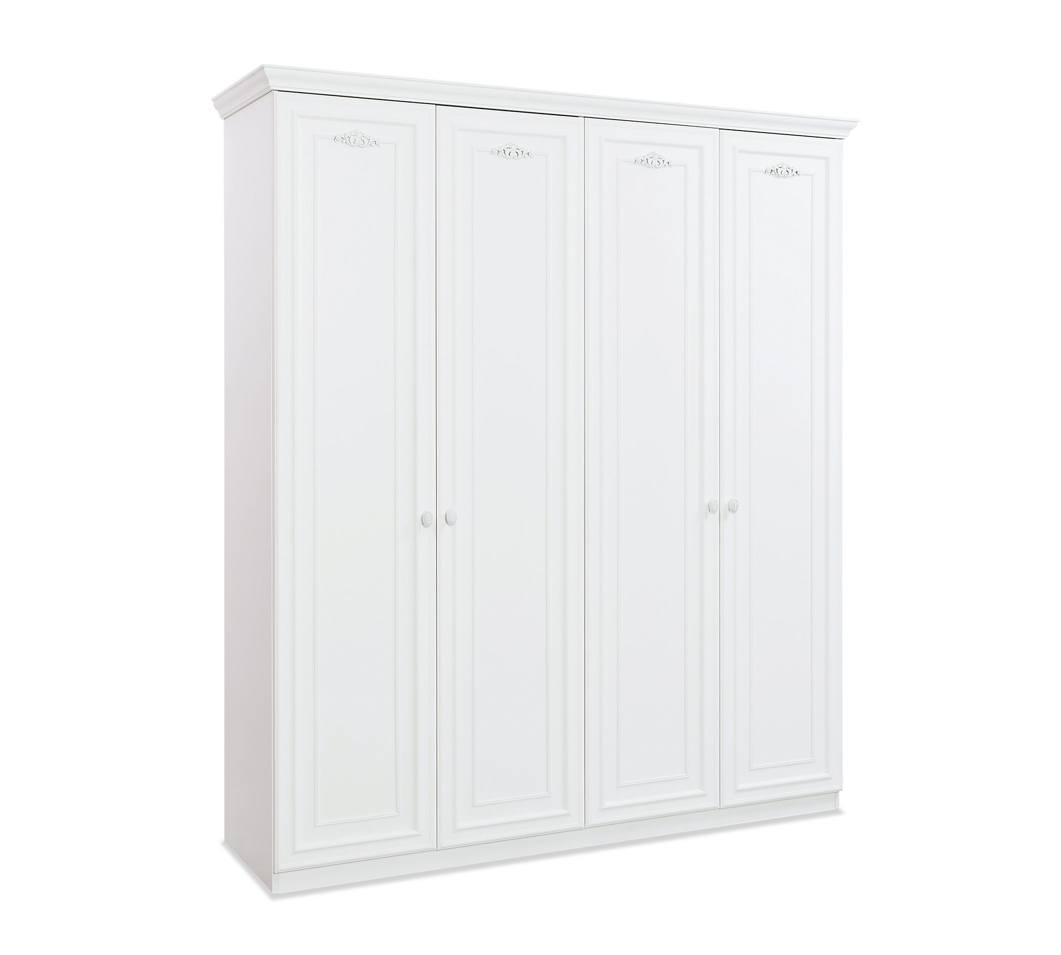 Kleiderschrank ROMANTIC ist mit viel Liebe zum Detail gestaltet. Все vier Türen sind mit dekorativen Leisten und floralen Elementen geschmückt. Groszügiger Stauraum, mit mehreren Einlegeböden und einer Kleiderstange, bietet viel Platz für Kleidung grosser und kleiner Mädchen.