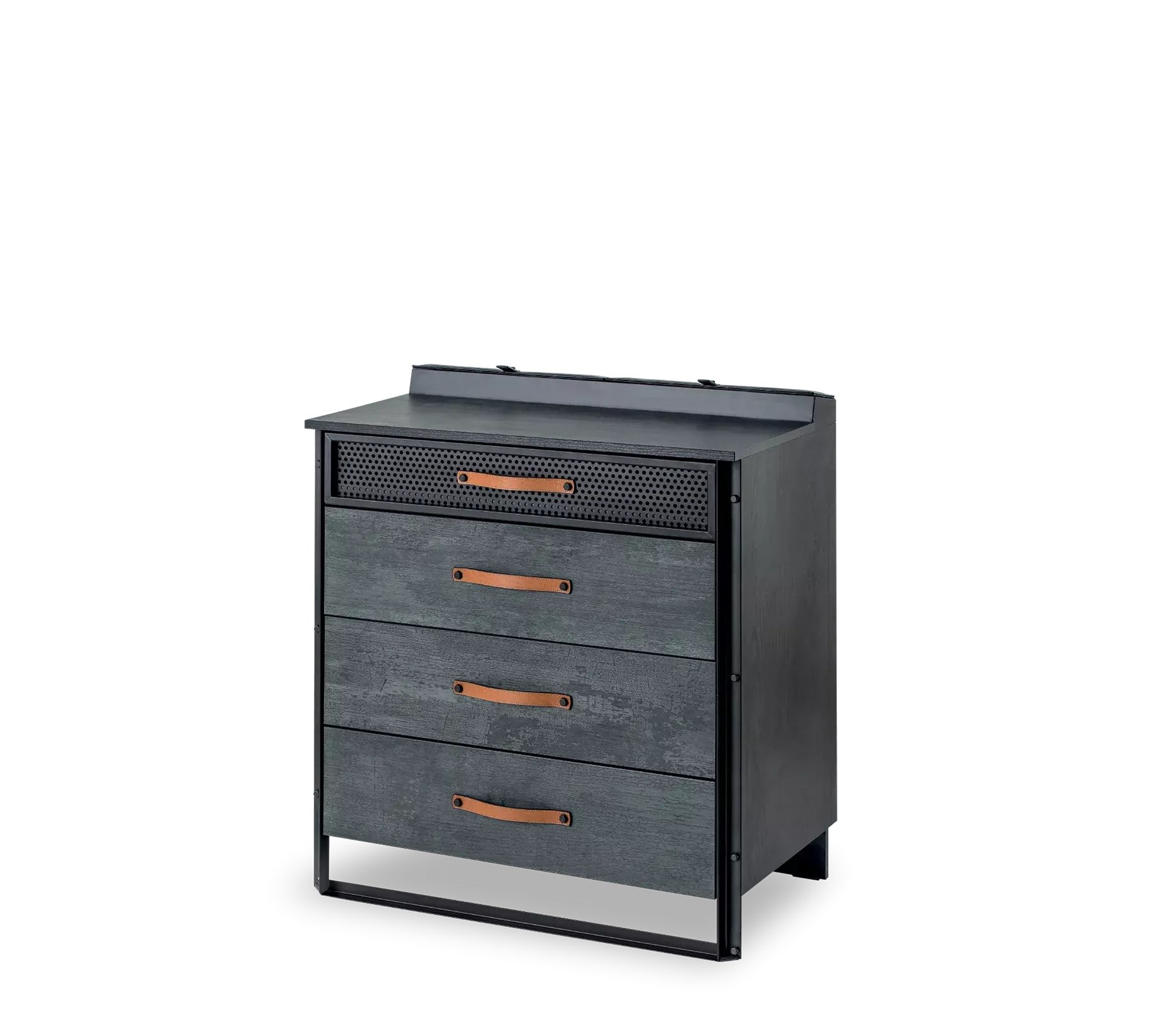 Die moderne Dark Metal Kommode mit den lässigen handgefertigten Ledergriffen und einer Lochblechblende, wird der neue Blickfang im Jugendzimmer.