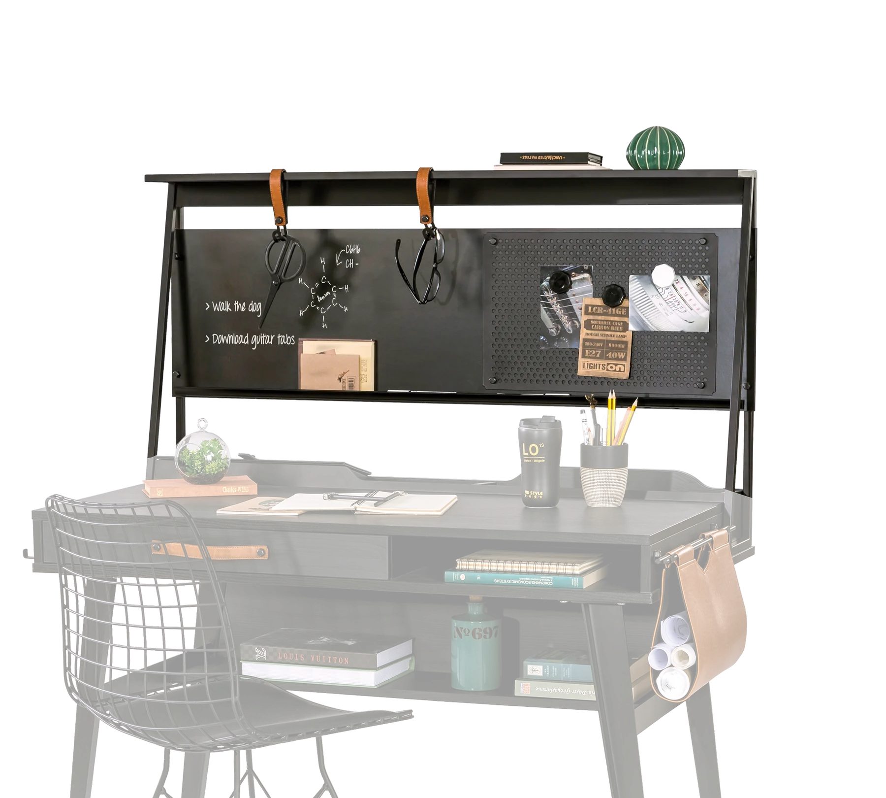 Der Dark Metal Schreibtisch kombiniert frische Moderintät mit innovativer Praxis. Neben der lässigen Projekttasche und dem ledernen Schubkastengriff, können im oberen Ablagefach ganz bequem Tablet, Handy und Co. über USB geladen werden. Alternativ kann der Schreibtisch mit dem Aufsatz auch noch um eine Schreibfläche und ein Magnetboard erweitert werden.