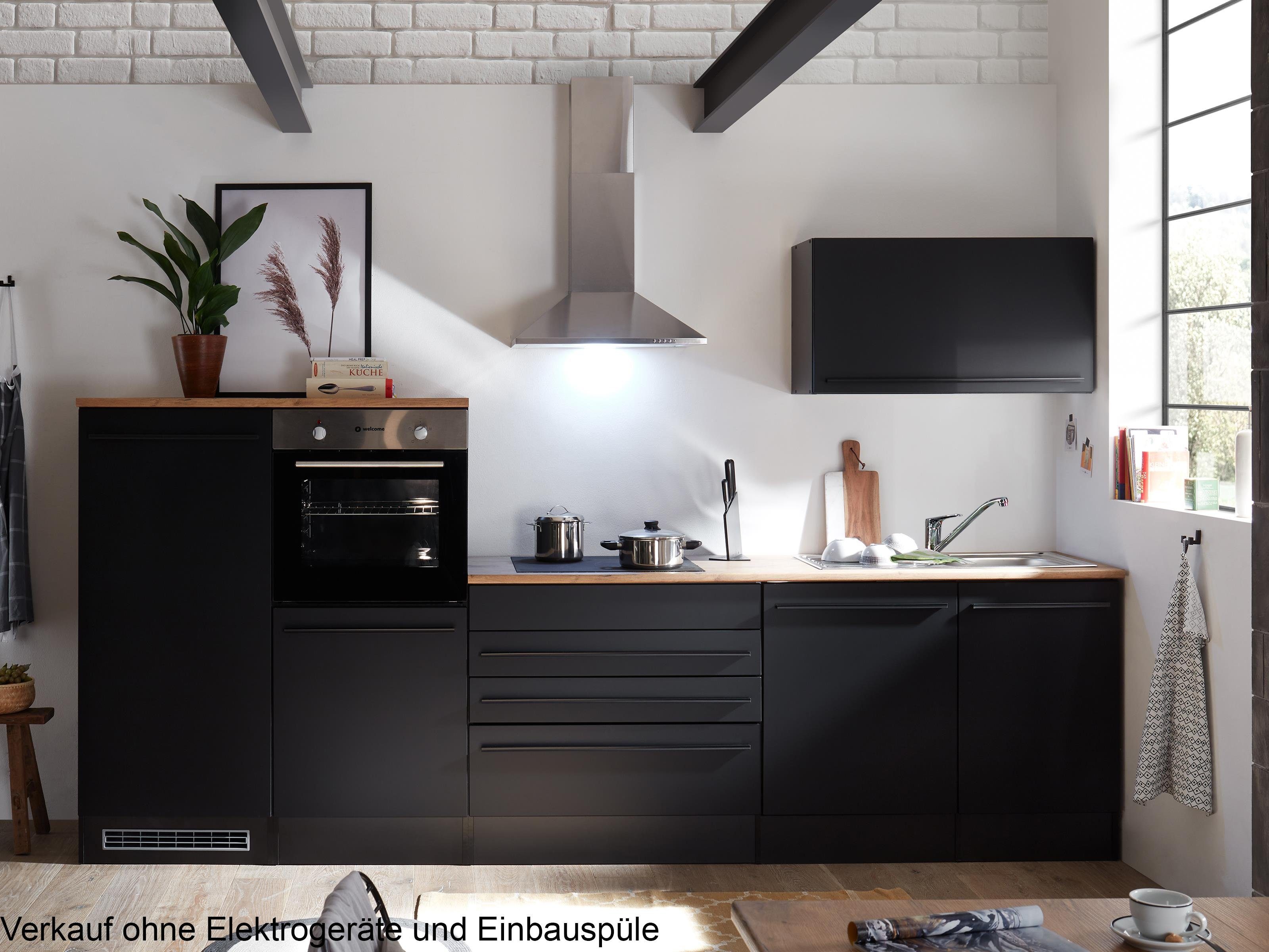 Die Küchenzeile "Jamesy II" ist mit einem Korpus in mattem Schwarz und einer Front in Schwarz matt tiefzieh erhältlich. Die Arbeitsplatte ist in außergewöhnlicher Lanzelot Eiche Nachbildung gehalten, die in Verbindung mit den Schwarz matten Griffen stilvoll das äußere Erscheinungsbild der Küche abrunden.
