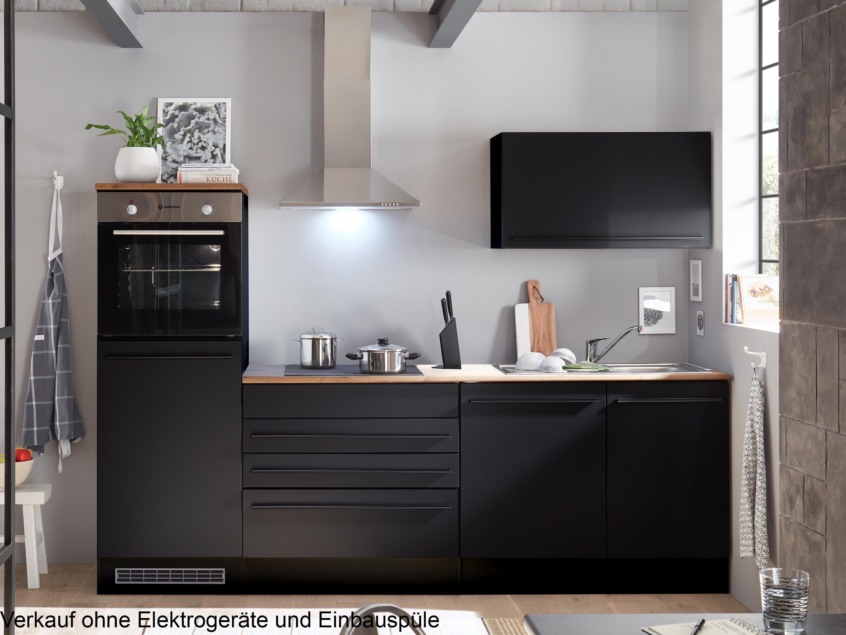 Die Küchenzeile "Jamesy IV" ist mit einem Korpus in mattem Schwarz und einer Front in Schwarz matt tiefzieh erhältlich. Die Arbeitsplatte ist in außergewöhnlicher Lanzelot Eiche Nachbildung gehalten, die in Verbindung mit den Schwarz matten Griffen stilvoll das äußere Erscheinungsbild der Küche abrunden.