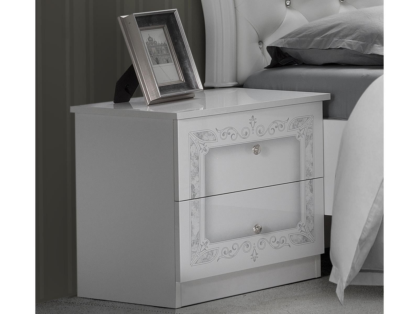 Die Nachtkommode "Langston I" ist mit einem Korpus klarem Weiß und einer Front in strahlendem Weiß-Hochglanz erhältlich. Die eindrucksvollen und aufwendig gestalteten Verzierungen in eleganten Silberfarben, sowie die edlen Knopfgriffe sorgen hier für eine unglaublich ästhetische Ausstrahlung und garantiert für neidische Blicke.