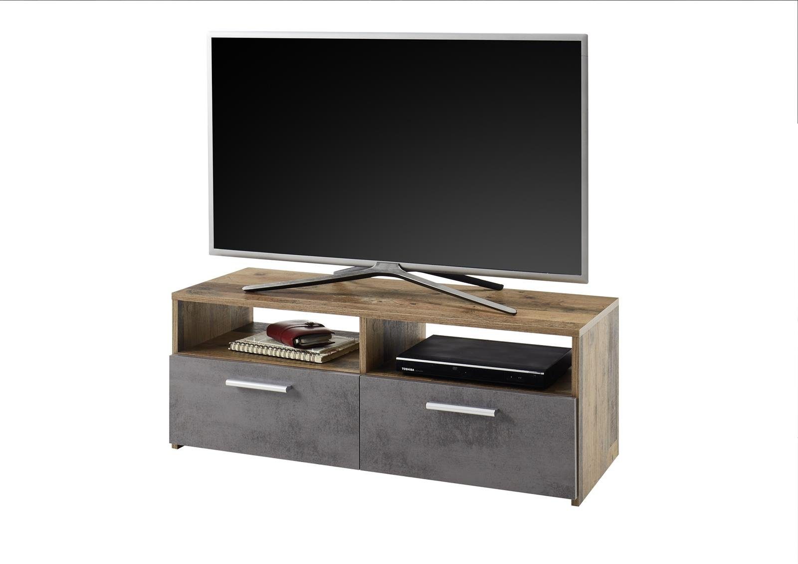 Das TV-Lowboard "Ruth I" ist hier mit einem Korpus in dunkler Old Style Nachbildung erhältlich, welche stilvoll mit einer Front in attraktiver Roxy Anthrazit Nachbildung kombiniert wird. Dank seines schlichten Designs fügt sich "Ruth I" mühelos und harmonisch in sämtliche Farbkonzepte ein. Hierbei glänzt es mit dezenter Назадhaltung ohne unterzugehen, ganz im Gegenteil: Durch seine minimalistische Erscheinung hebt es die optische Erscheinung seines Umfelds und wertet es gekonnt auf. Die Holz- bzw. Betonnachbildung ist qualitativ sehr hochwertig mit täuschend echter Maserung bzw. Struktur.