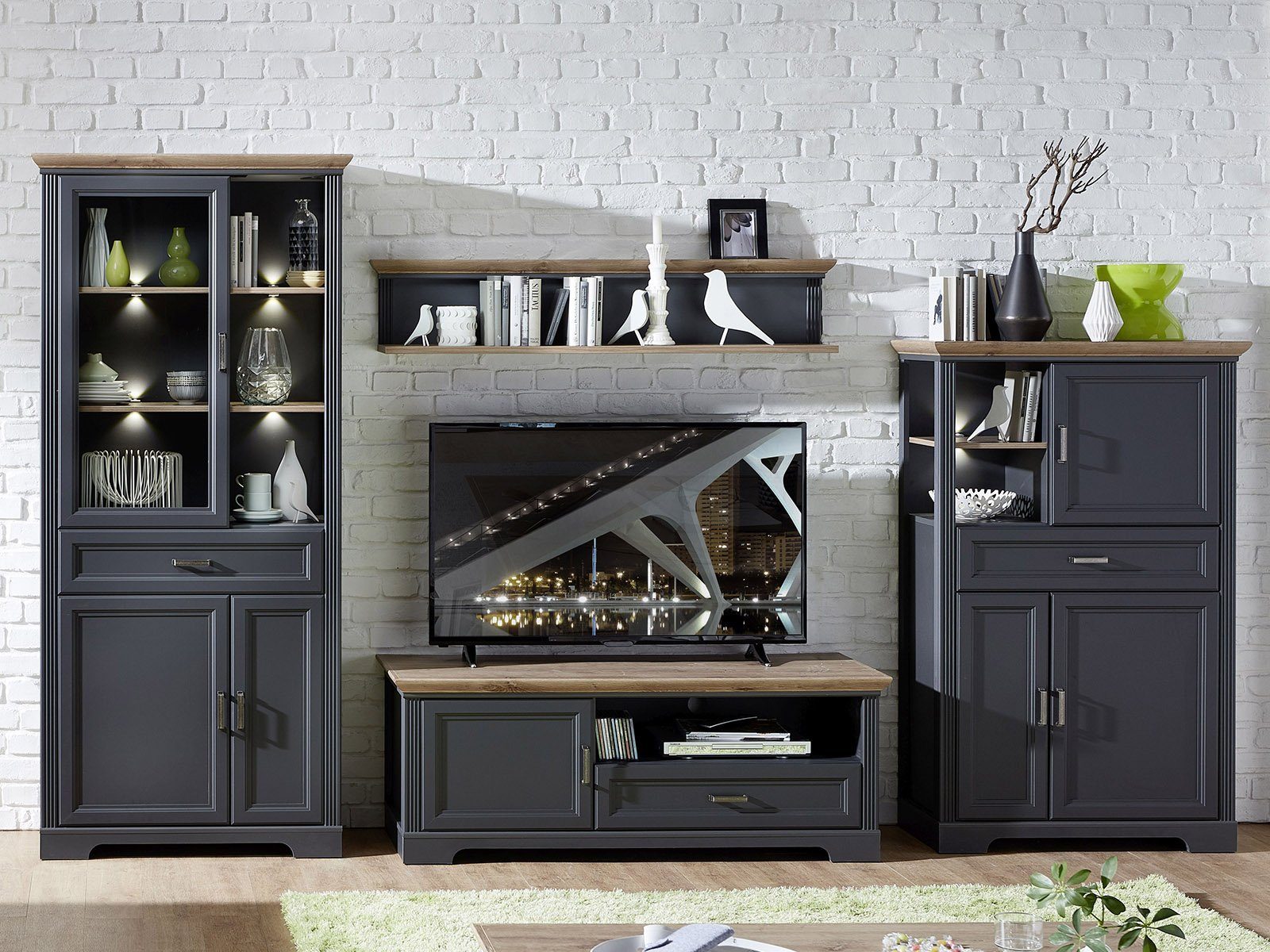 Die Wohnwand "Jasmin V" ist in elegantem Graphit erhältlich, welches stilsicher mit Absetzungen in vornehmer Artisan Eiche Nachbildung kombiniert wird. Insbesondere in Verbindung mit den antiken Metallgriffen, sowie den Ausfräsungen der Front wird der Wohnwand eine ländlich angehauchte, heimelige Erscheinung verliehen. Die Holznachbildung ist qualitativ sehr hochwertig mit täuschend echter Maserung.