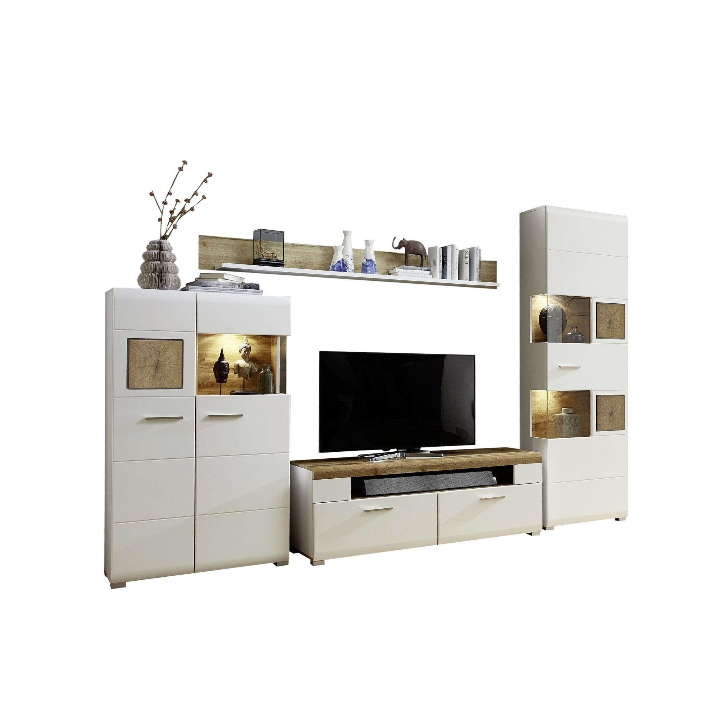 Die Wohnwand "Kathlin II" erfreut durch ungeahnten Stauraum: 1 große Vitrine, 1 kleine Vitrine, 1 TV-Lowboard und 1 Wandboard, mehr braucht es als Wohnwand nicht. Abgerundet wird das Ensemble durch die stilvollen LED-Beleuchtung, die für einen besonders edlen Look sorgen.