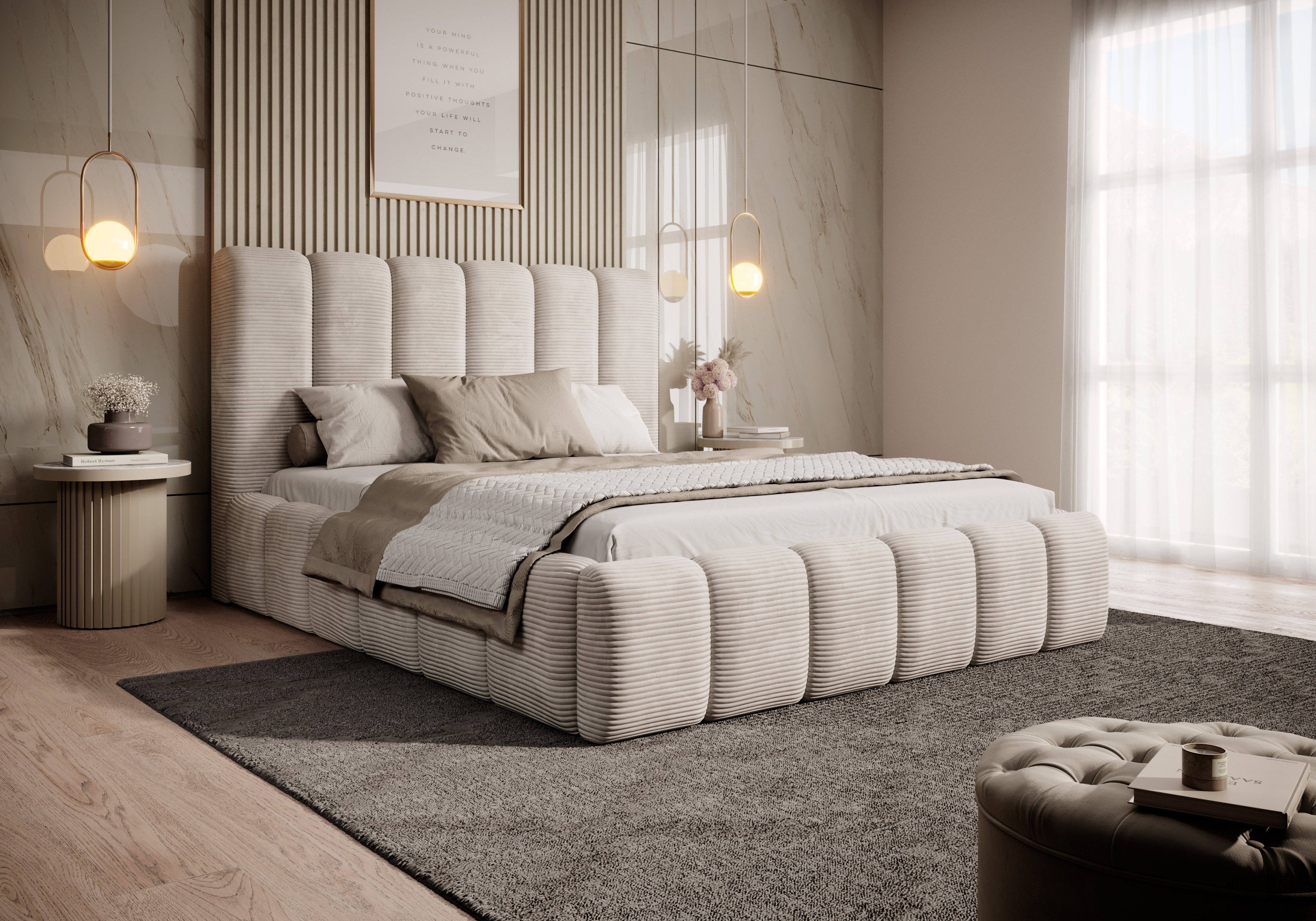 Das Polsterbett Nebula aus der Poso Kord Kollektion besticht durch seine weiche Eleganz und bietet gleichzeitig praktische Funktionalität für den modernen Schlafbereich. Der flauschige, dicke Kordstoff verleiht dem Bett nicht nur eine gemütliche Ausstrahlung, sondern sorgt auch für ein angenehmes Hautgefühl, ideal für erholsame Nächte.