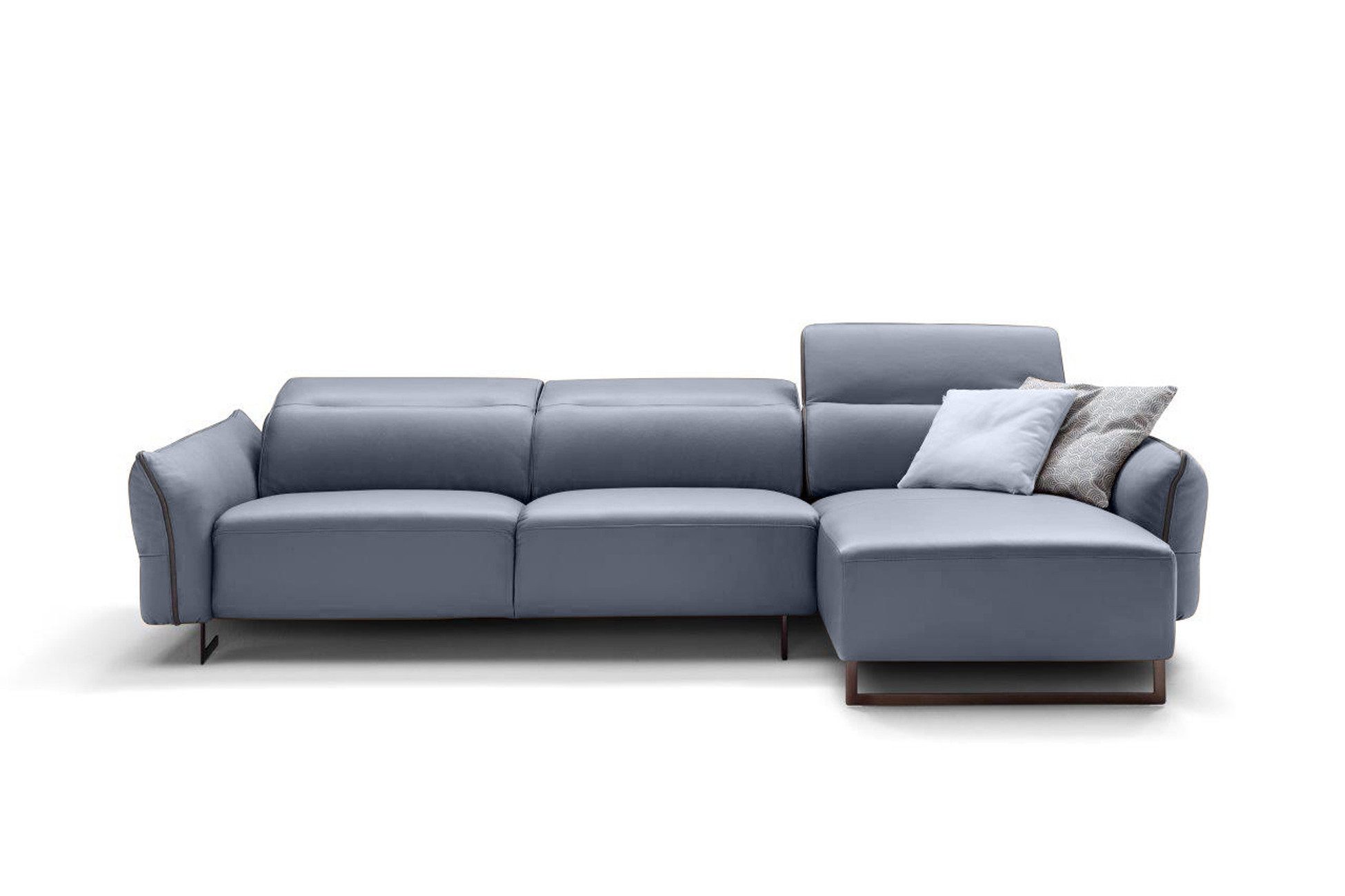 Das Ecksofa Leder Milano besticht durch sein modernes Design mit klaren Linien und wohldefinierten Volumen. Die Metallfüße verleihen dem Sofa eine angenehme Leichtigkeit und betonen die entspannte Ästhetik. Die Liebe zum Detail zeigt sich in den Lederkanten an Armlehnen und Rückenlehnen sowie in der dekorativen "Kreuzstich"-Verzierung an der Seite der Armlehne - raffinierte Elemente, die den hochwertigen Charakter des Milano unterstreichen.