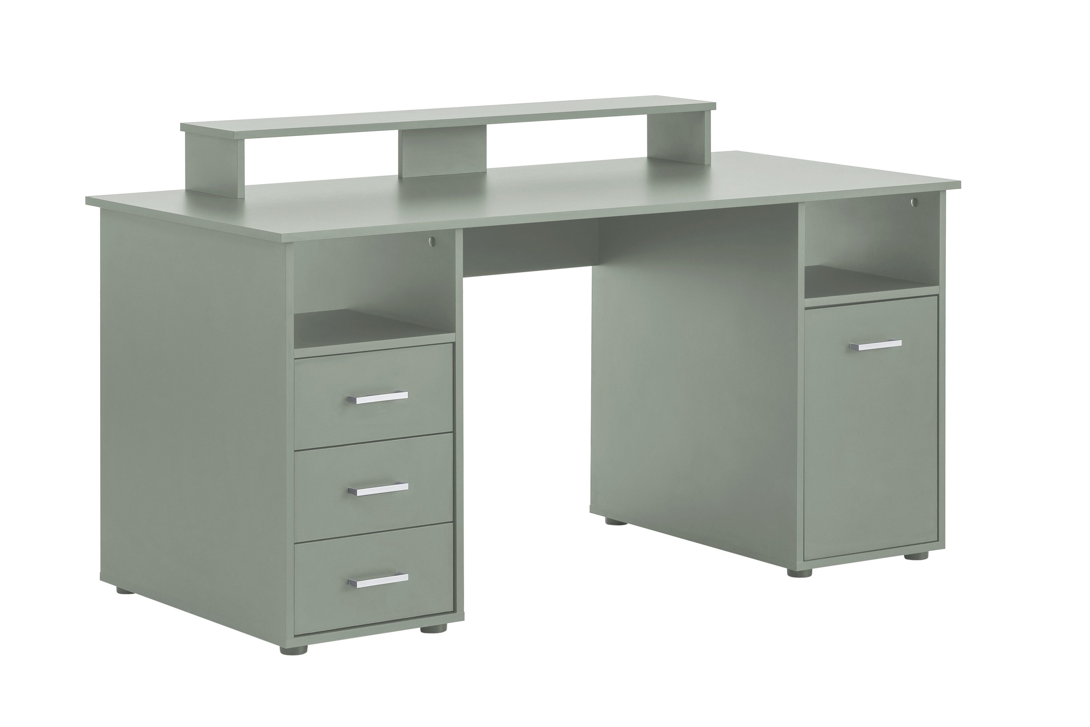 Die Tischplatte ist mit Melaminharz der Güteklasse E1 beschichtet und dadurch besonders robust. Durch die Schränke an den jeweiligen Seite ist der Tisch sehr stabil und wackelt absolut gar nicht. Der Schreibtisch bietet genügend Platz für Bildschirm, Rechner und Tastatur, sowie jeglicher Schreibunterlagen.