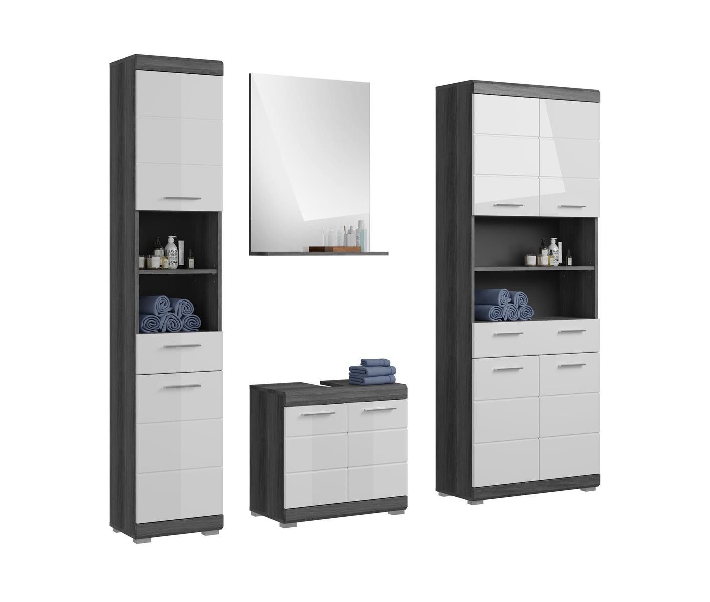 Verleihe deinem Badezimmer den ultimativen Style mit unserer Badkombination in angesagtem Rauchsilber Nachbildung und weißem Hochglanz tiefgezogenem Finish. Mit ihrem trendigen Design und der hochwertigen Verarbeitung setzt sie ein modernes Statement in deinem Zuhause. Entdecke jetzt die perfekte Verbindung von Coolness und Funktionalität für dein Badezimmer!