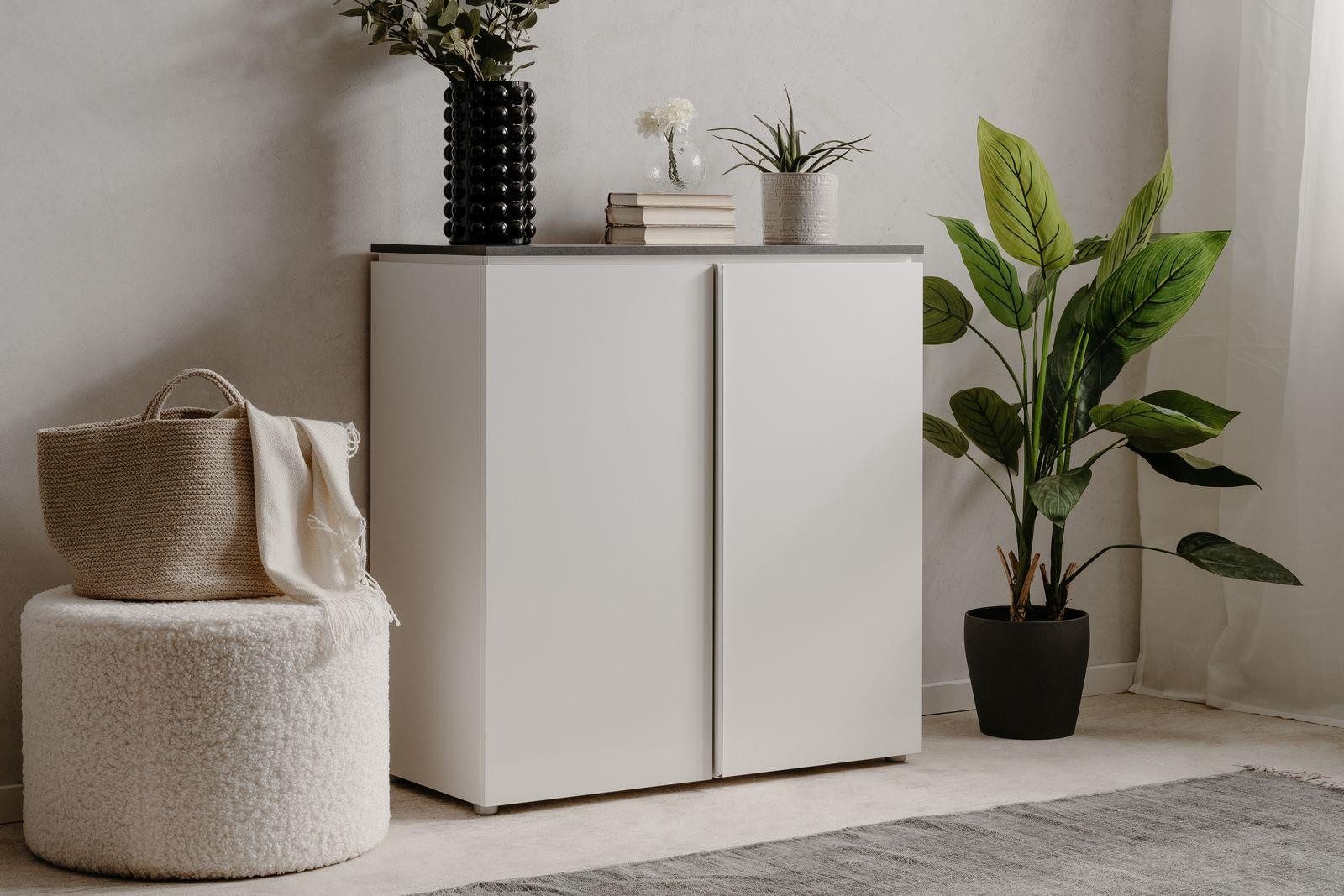 Dank der zwei Türen und zwei durchgehenden Einlegeböden können Sie Ihre Sachen ordentlich organisieren. Die silbernen Kunststofffüße und die chromfarbigen Kunststoffgriffleisten unterstreichen das zeitgemäße Design.
