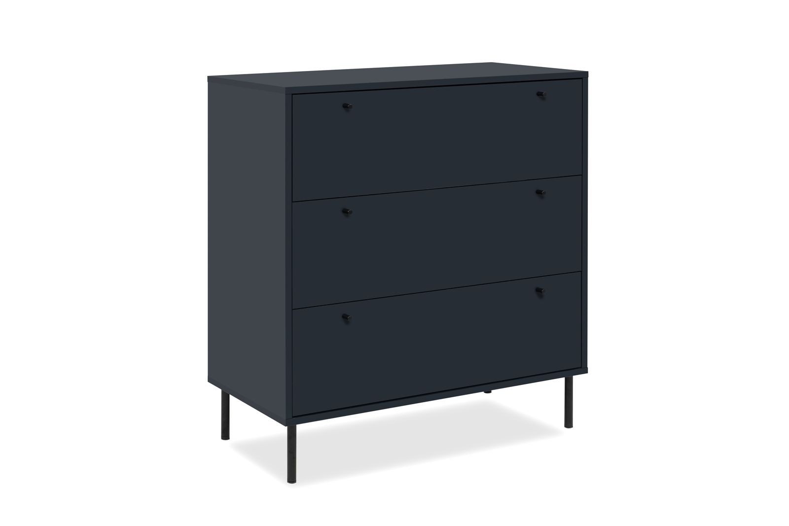 Mit Maßen von ca. 80 x 90 x 40 cm bietet sie ausreichend Platz für Ihre persönlichen Gegenstände. Das Dekor in Navy blau verleiht ihr einen modernen und frischen Look, der jeden Raum aufwertet. Die schwarzen Metallfüße, die ca. 14 cm hoch und höhenverstellbar sind, verleihen der Kommode eine elegante Note. Die drei geräumigen Schubladen mit schwarzen Metallknöpfen bieten praktischen Stauraum für Kleidung, Accessoires oder andere Gegenstände.