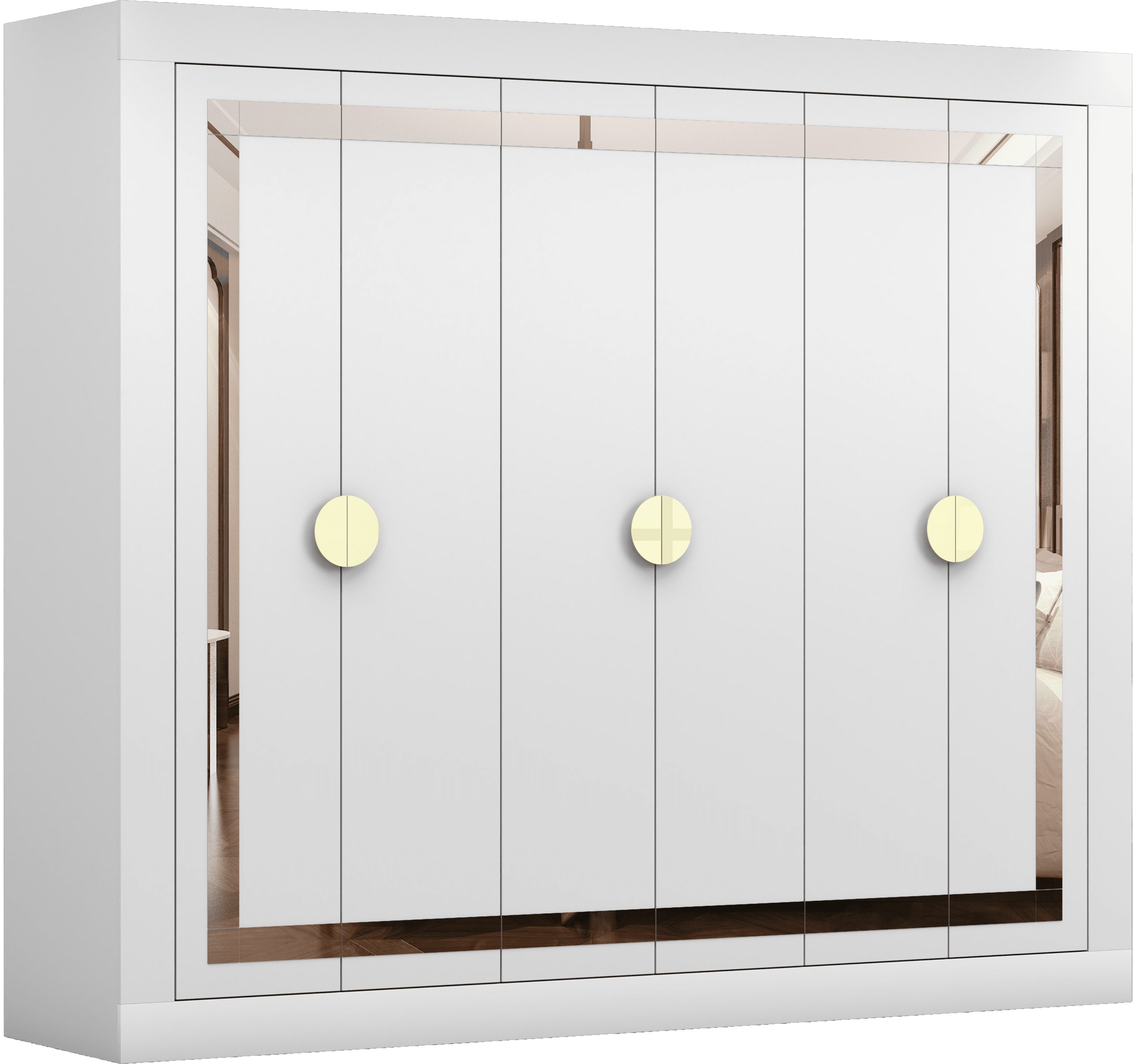 Der Lumine 2 Schrank ist ideal für diejenigen, die sowohl ästhetischen Anspruch als auch praktischen Stauraum suchen. Mit großzügigen Maßen und einer durchdachten Innenaufteilung bietet der Schrank ausreichend Platz, um Ordnung in Ihrem Schlafzimmer oder Ankleidezimmer zu schaffen. Die traditionellen Türen sorgen für einfachen Zugang, während die goldenen Akzente und Spiegel das Design abrunden.