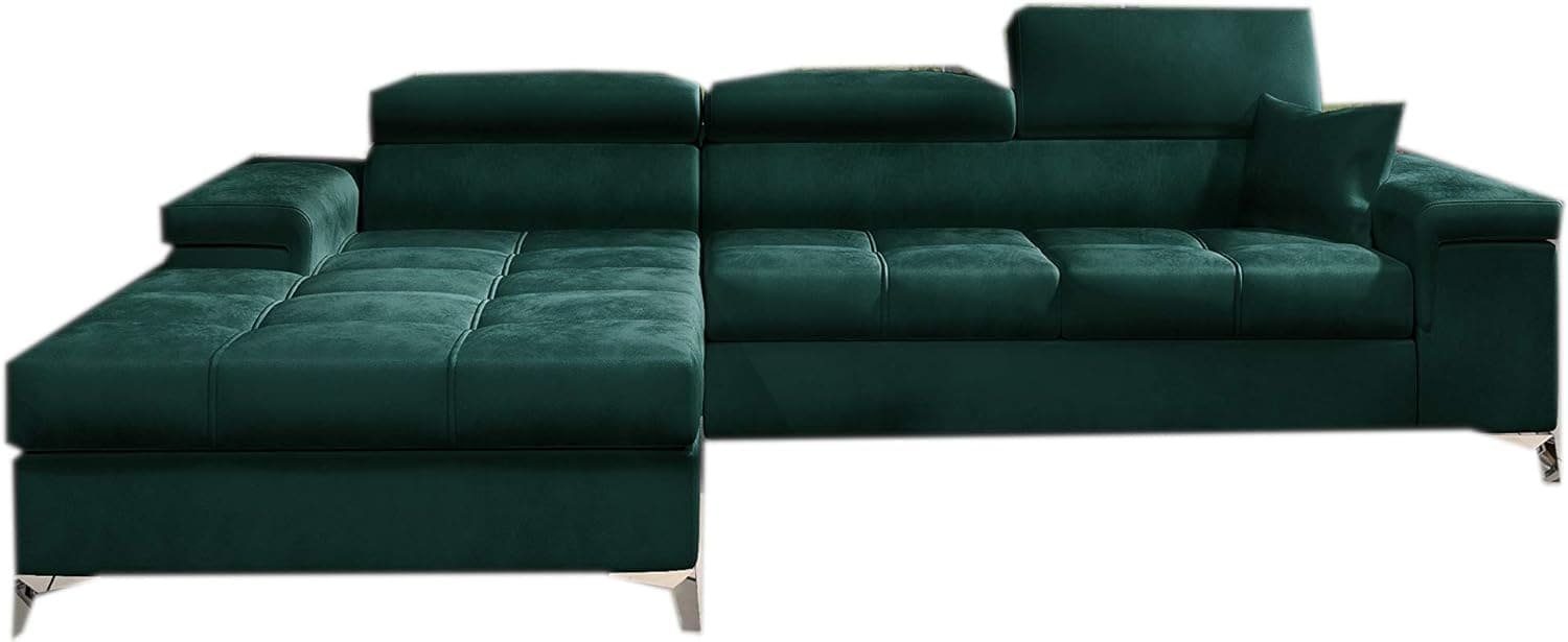 Das Ecksofa Ronaldo ist ein Synonym für Eleganz und Komfort. Die verstellbaren Kopfstützen ermöglichen eine individuelle Anpassung an die Bedürfnisse, während die breite, bequeme Ottomane zusätzlichen Entspannungsraum bietet. Die eleganten Nähte der Sitzfläche betonen den raffinierten Charakter des Möbels, das auf schönen, silbernen, hohen Beinen steht. Der praktische, große Bettkasten und die geräumige Schlaffunktion machen es nicht nur attraktiv, sondern auch äußerst funktional. Die Verfügbarkeit in einer klassischen Farbpalette erleichtert die Anpassung an verschiedene Einrichtungsstile und verleiht ihnen Komfort und harmonisches Aussehen. Es ist ein Möbelstück, das das tägliche Leben einfacher und stilvoller macht.
