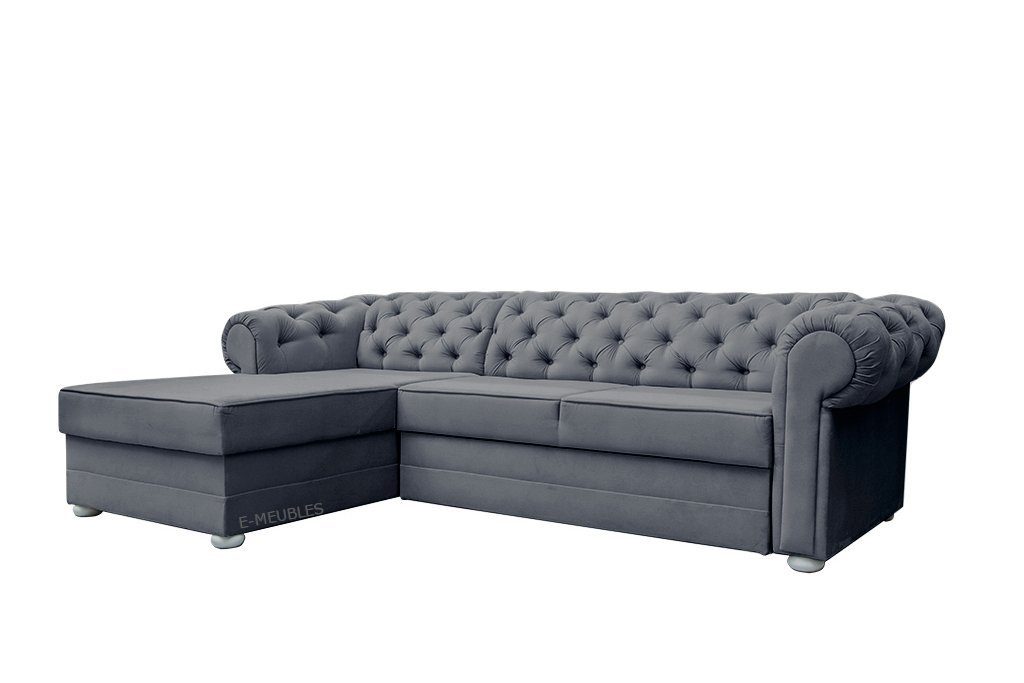 Der elegante Ecksofa mit dekorativen Knopfsteppungen auf der Rückenlehne vereint klassische Ästhetik mit praktischer Funktionalität. Es ist mit einem Bettkasten und einer Schlaffunktion ausgestattet, verfügbar in einer klassischen Farbpalette sowie in hellen, pastellfarbenen Tönen.