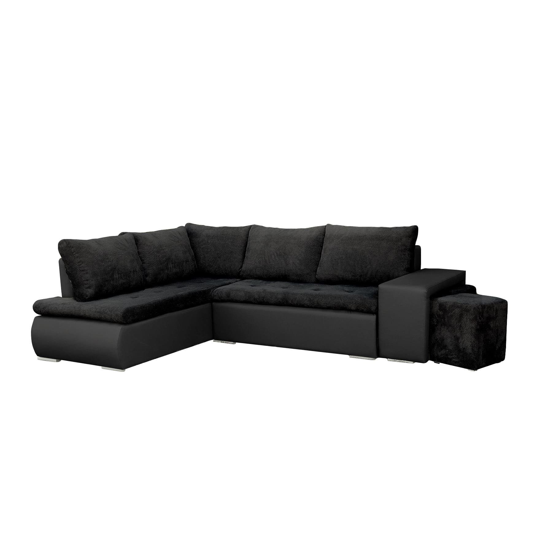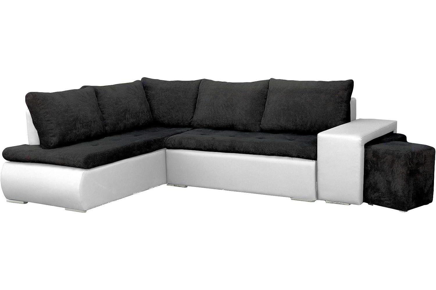 Dieses moderne Ecksofa, das Funktionalität und Stil in sich vereint, fügt sich perfekt in Ihre häuslichen Bedürfnisse ein. Gefertigt aus einer Kombination von zwei hochwertigen Materialien - strapazierfähigem Kunstleder und weichem, gewebtem Velours - bietet es den Komfort, den Sie nach einem langen Tag benötigen. Ausgestattet mit einer praktischen Schlaffunktion sowie einem Bettkasten, stellt es eine hervorragende Lösung für diejenigen dar, die von ihren Möbeln Mehrzweckfunktionalität erwarten. Zusätzlich enthält das Set zwei Hocker, die als zusätzliche Sitzgelegenheiten oder bequeme Fußstützen dienen können.