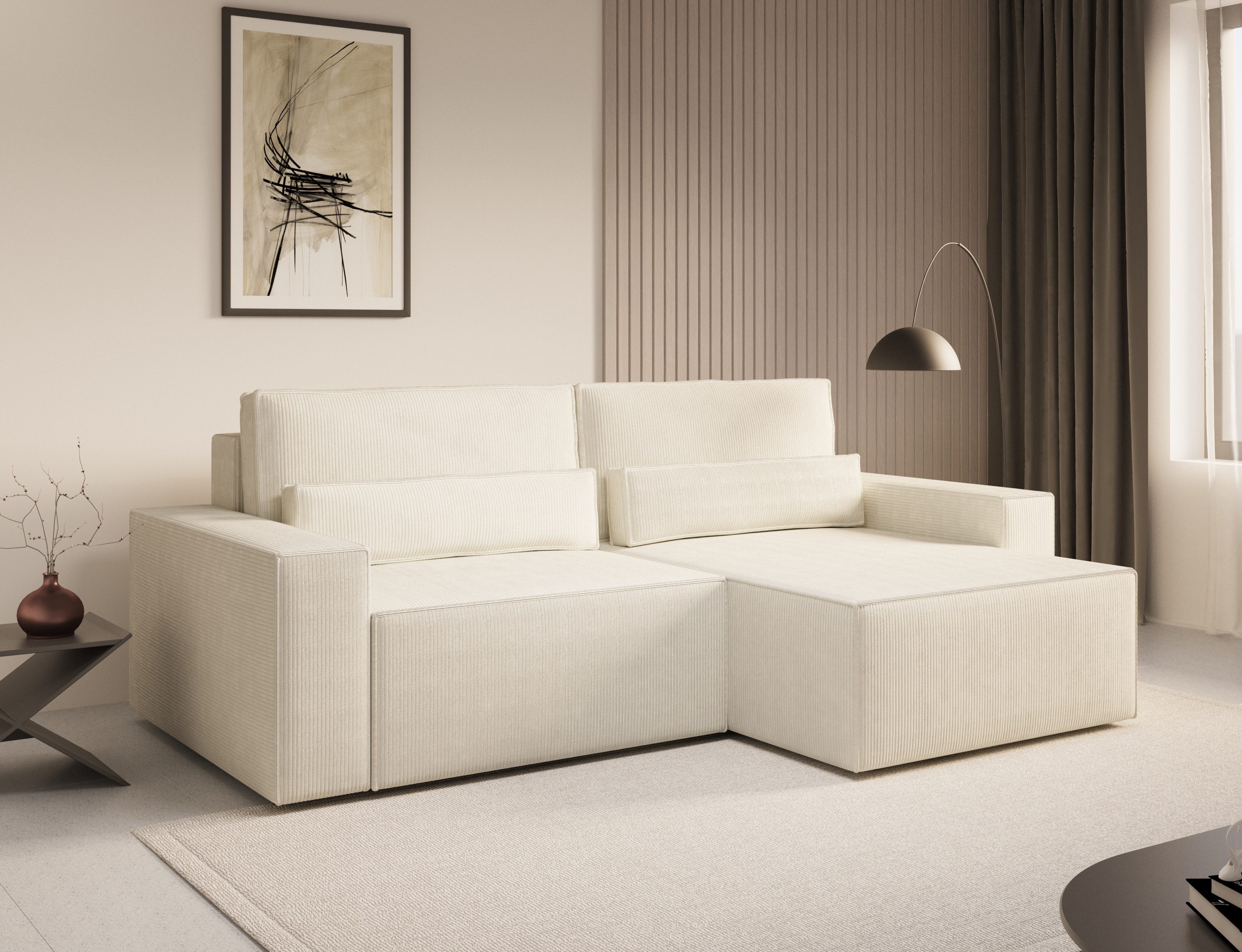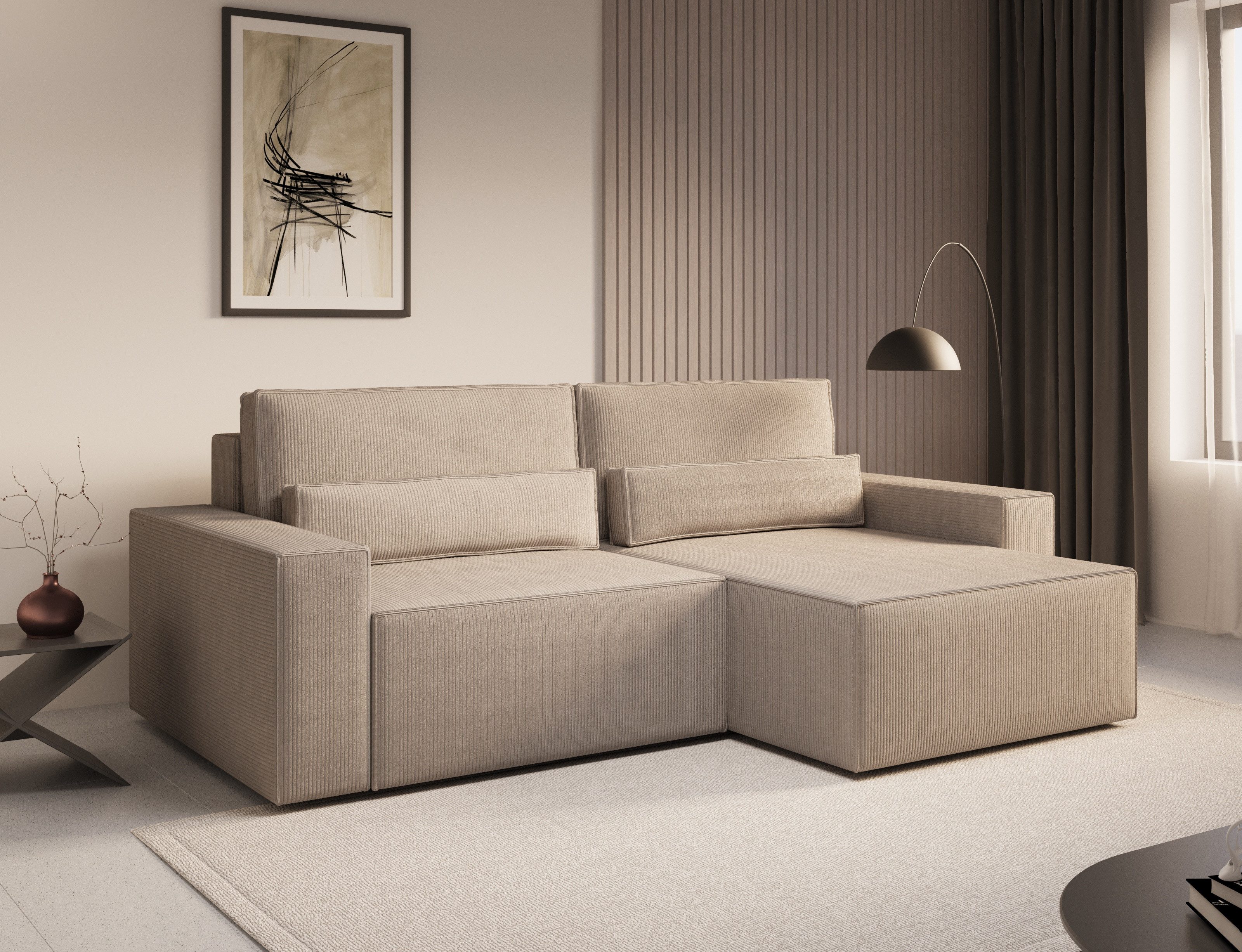 Das Ecksofa DENVER MINI aus Cordstoff ist die perfekte Ergänzung für Ihr Wohn- oder Gästezimmer. Trotz seiner kompakten Abmessungen bietet es genügend Platz für Sie und Ihre Gäste. Ob beim Fernsehen oder Lesen - dieses Sofa lädt zum Entspannen ein. Zudem dient das Ecksofa doppelt, indem es sowohl bequemen Sitzkomfort als auch eine Schlafmöglichkeit bietet. Dank eines innovativen Mechanismus lässt es sich problemlos in ein komfortables Bett verwandeln.