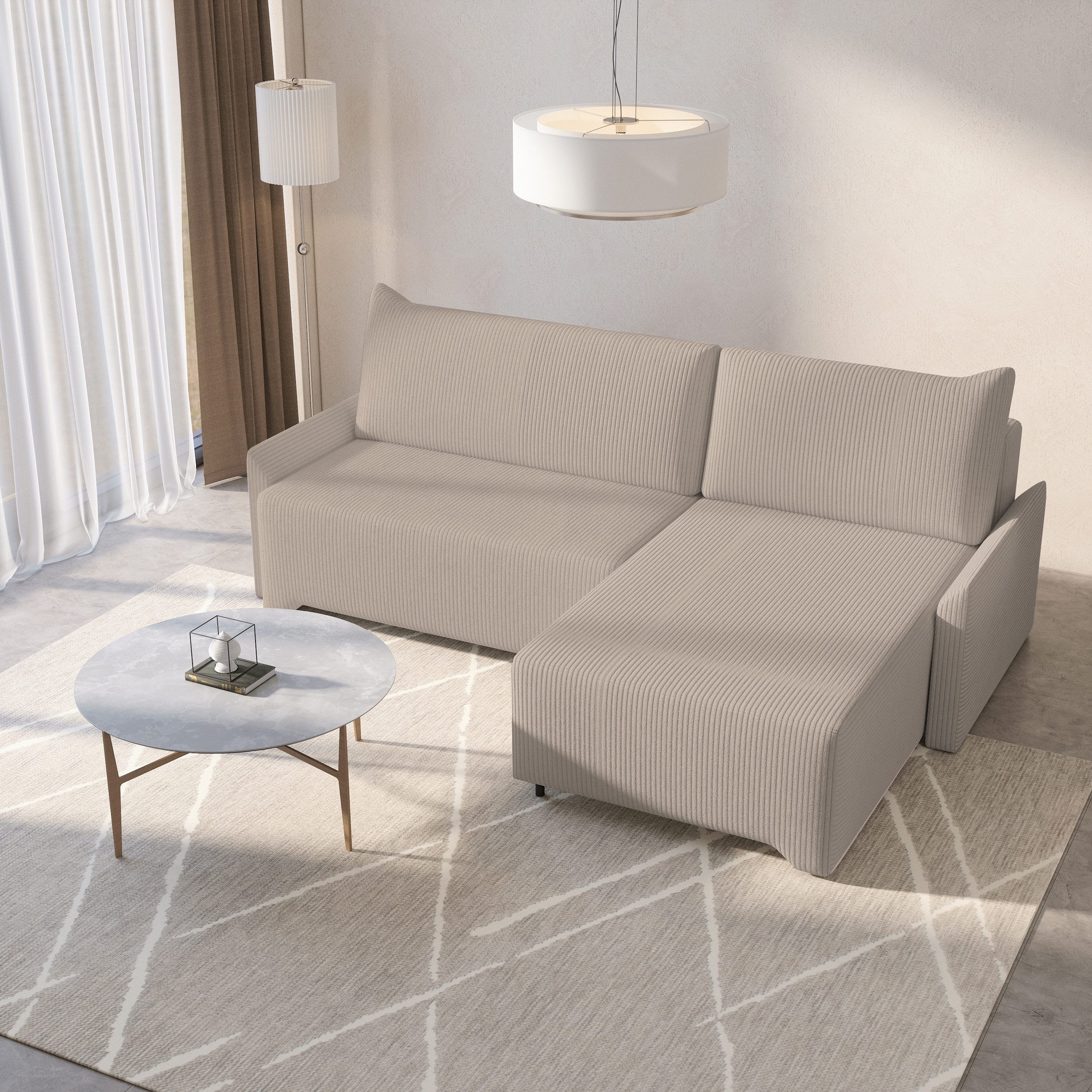 Das Ecksofa ROCKY vereint modernes Design mit außergewöhnlichem Komfort. Der elegante Cordstoff POSO verleiht dem Raum eine warme Note und macht das Sofa zu einem echten Blickfang. Perfekt zum Entspannen am Abend oder als Schlafplatz für Gäste – ein Möbelstück, das Stil und Funktionalität harmonisch verbindet.