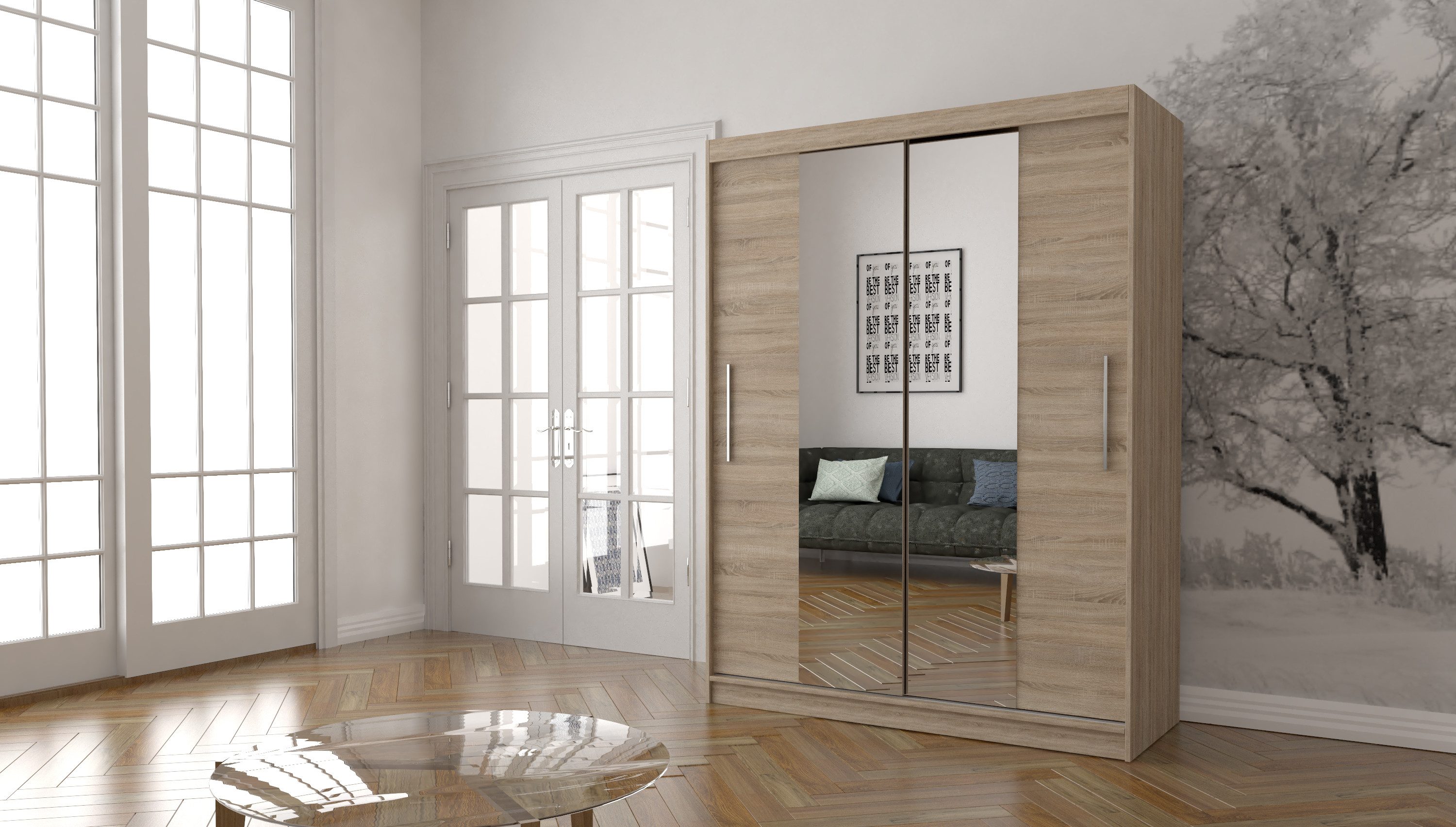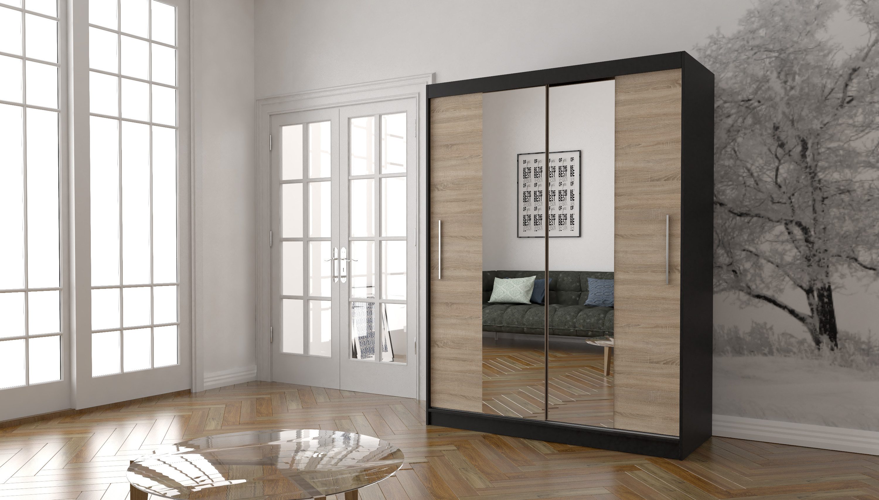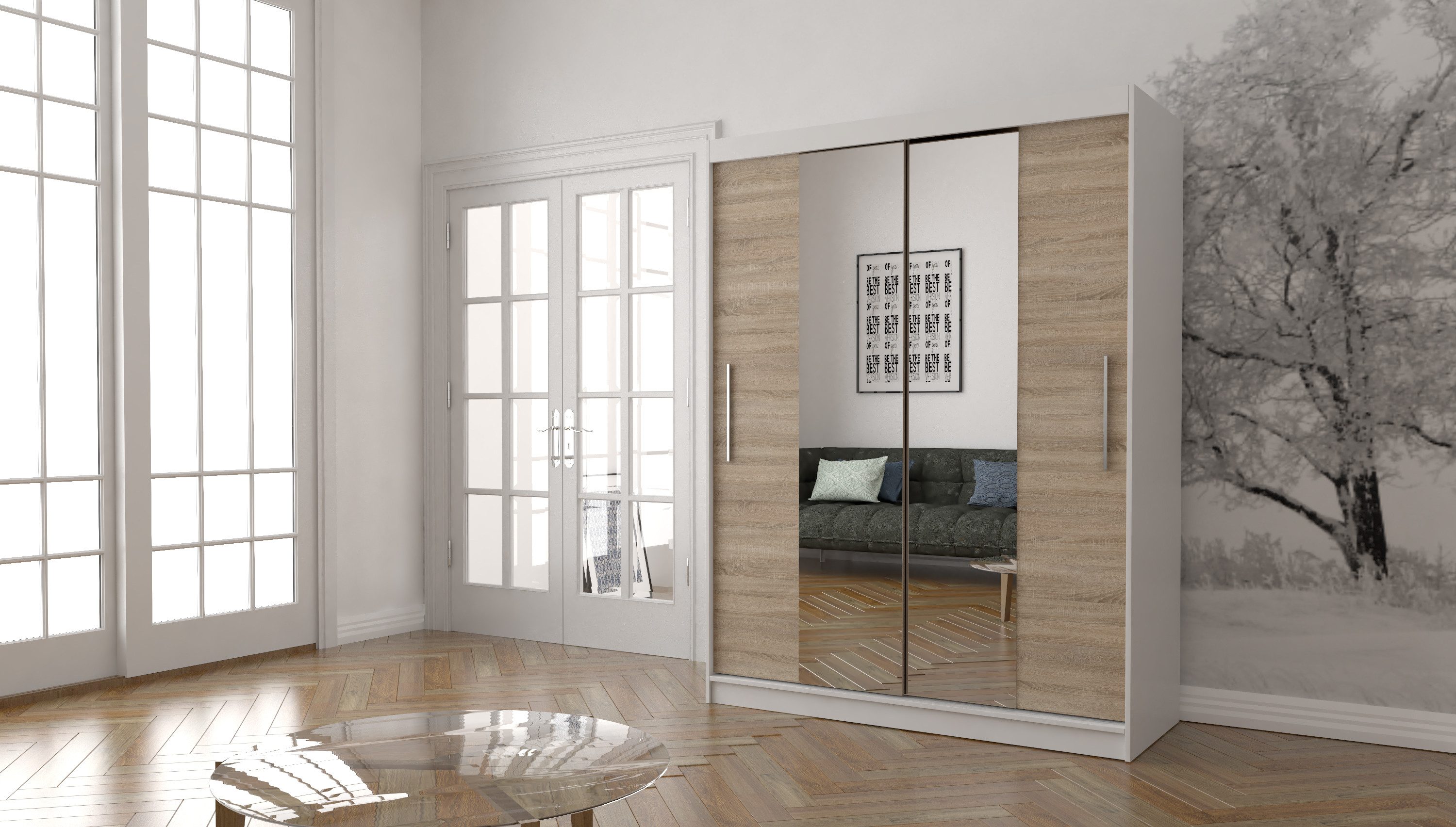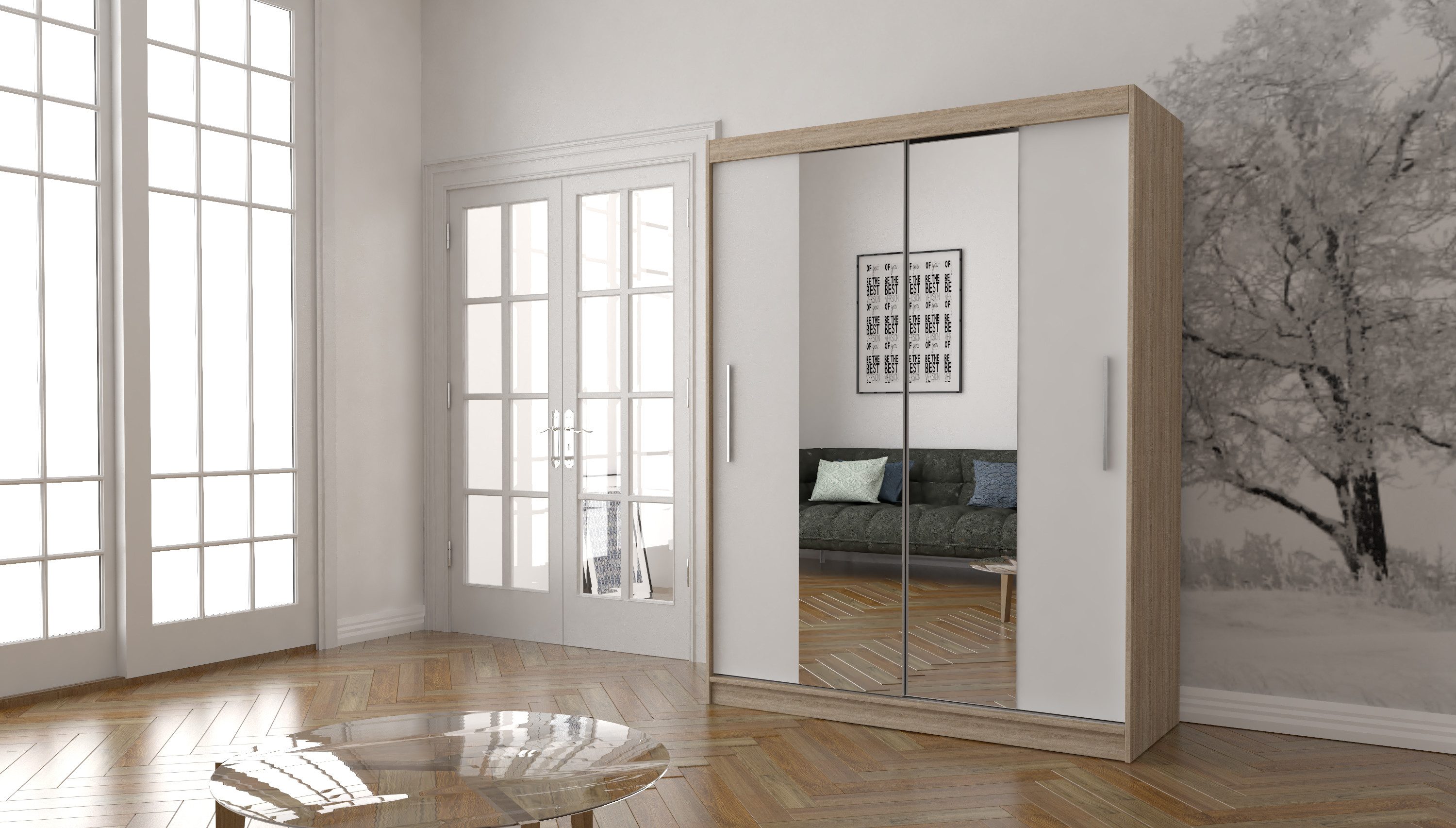 Modellbezeichnung | Kleiderschrank mit Spiegel Schwebetürenschrank 2-türig Schrank mit vielen Einlegeböden und Kleiderstange Gaderobe Schiebtüren Schlafzimmer-Wohnzimmerschrank Modern Design - Lara 01 |