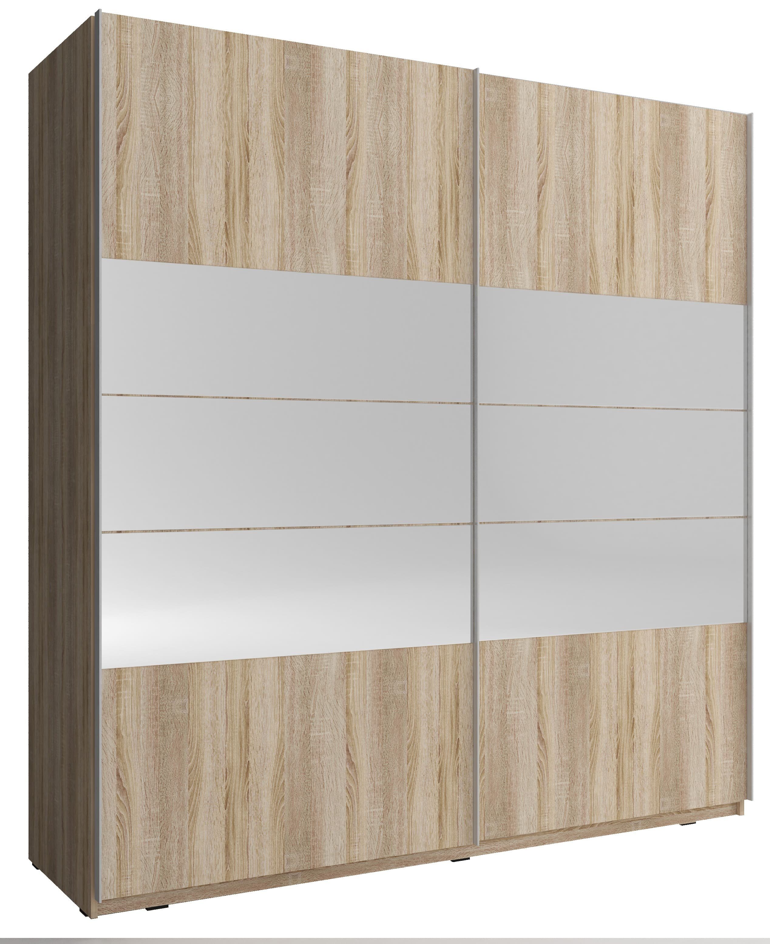 Die Schiebetüren des Schranks ermöglichen eine platzsparende Nutzung, da sie keinen zusätzlichen Platz zum Öffnen benötigen. Dies macht den Schrank besonders ideal für Räume mit begrenztem Platzangebot. Ein weiteres Highlight sind die eingebauten Spiegel, die nicht nur funktional sind, sondern dem Raum auch eine moderne und offene Atmosphäre verleihen. Der Spiegel vergrößert den Raum optisch und sorgt für ein angenehmes Ambiente in Ihrem Zimmer.