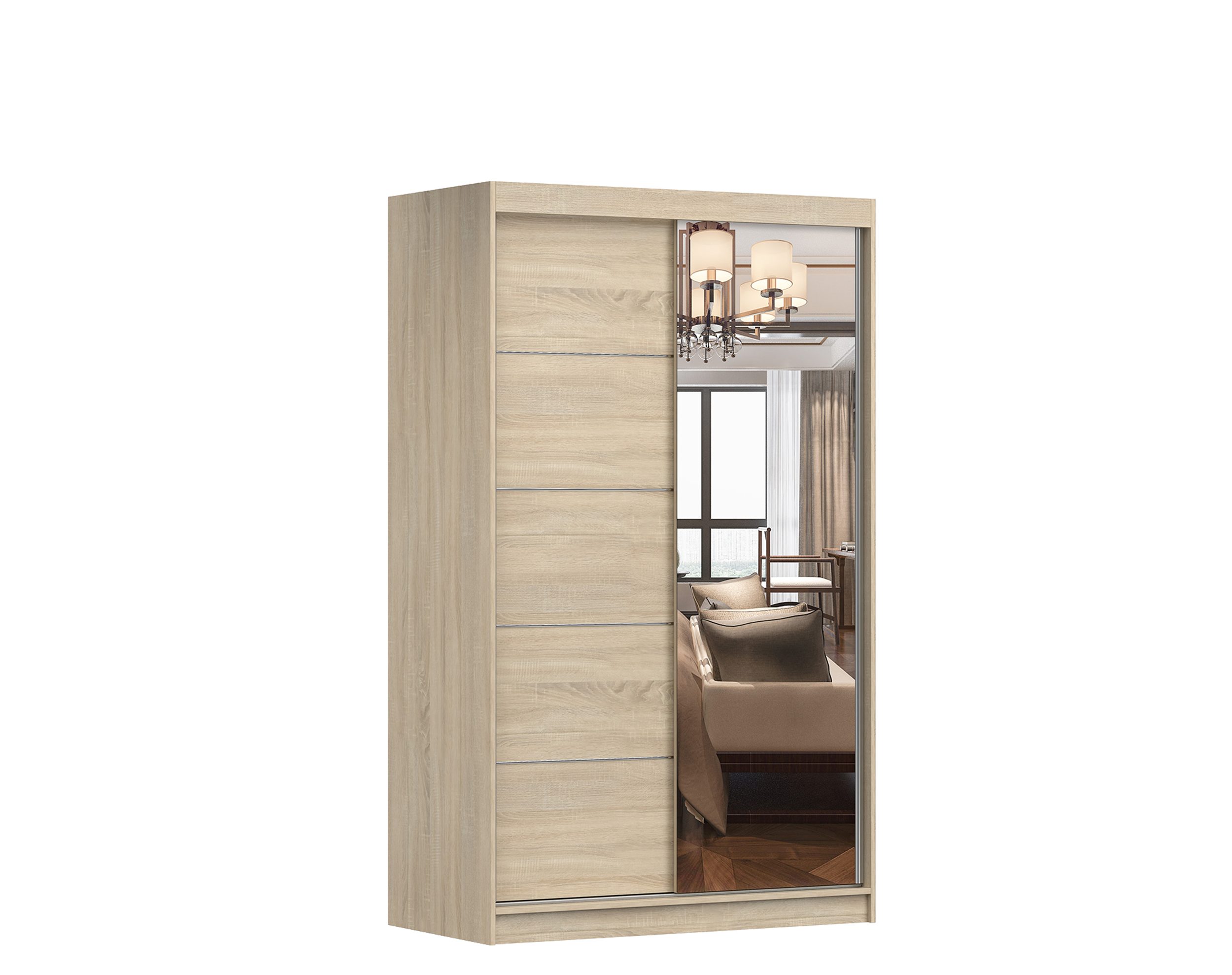 Der elegante Schrank Noah 05 mit Schiebetüren ist eine meisterhafte Kombination aus Funktionalität und Design. Ein großes Spiegel an einer der Fronten erweitert optisch den Raum und ist zugleich ein praktisches Element im täglichen Gebrauch. Die andere Seite der Tür ist mit dekorativen Aluminiumleisten verziert, was der gesamten Konstruktion einen modernen Charakter verleiht. Das Innenleben des Schrankes ist äußerst praktisch – eine solide Kleiderstange auf der einen Seite bietet ausreichend Platz für hängende Kleidung, während eine Reihe von Regalen auf der anderen Seite eine organisierte Aufbewahrung anderer Gegenstände ermöglicht.