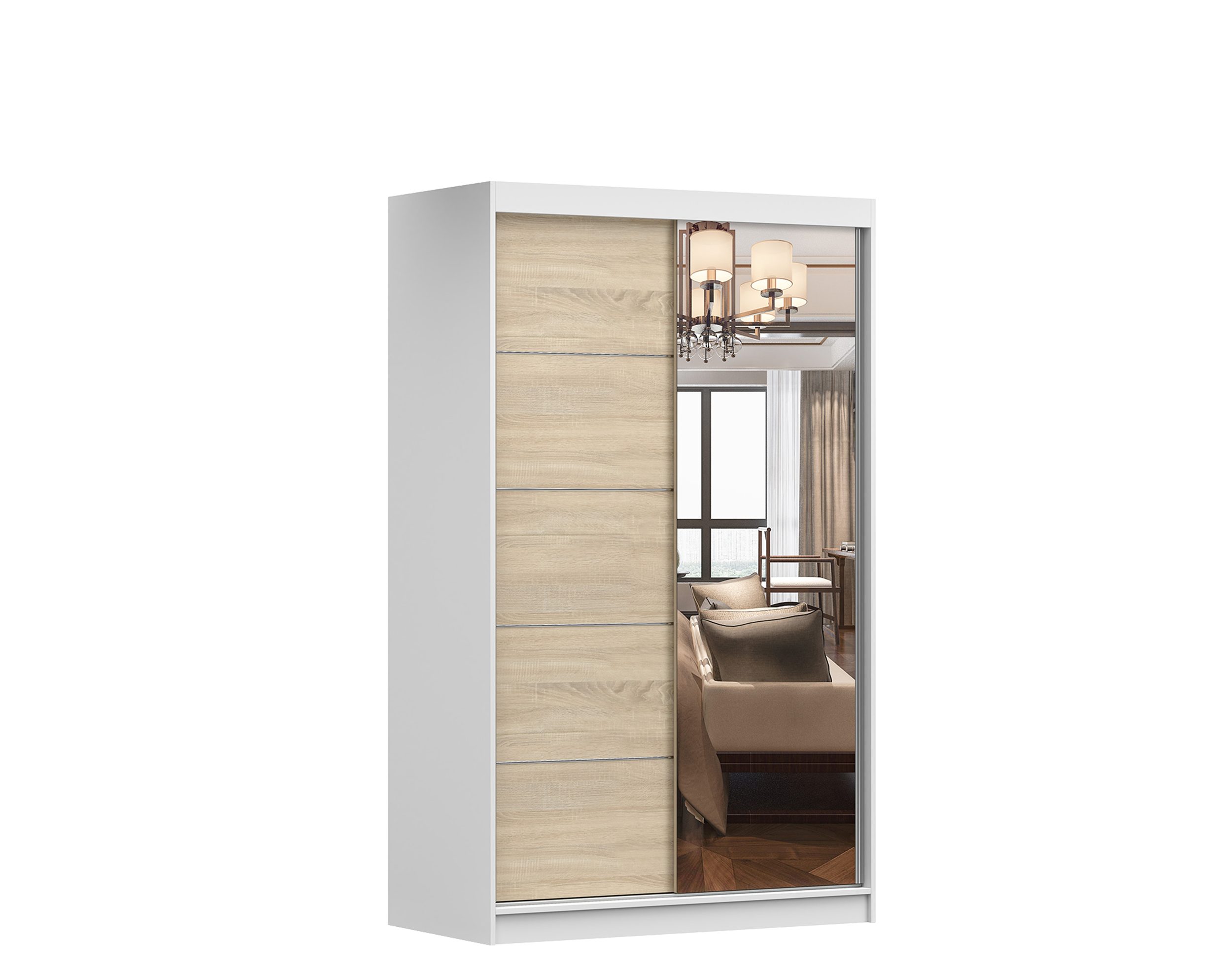 NOAH 05 ist ein verschiebbarer Kleiderschrank in modischen Farbkombinationen. Er passt ideal zu vielen Interieurs. Der Schrank verfügt über ein Schiebetürsystem, wodurch er einfach zu bedienen ist und keinen Platz wegnimmt. Er ist in zwei Teile unterteilt, die mit mehreren geräumigen Regalen und einer Stange ausgestattet sind.Die Spiegel an den Fronten und die klassischen Griffe verleihen dem Raum einen modernen Touch.