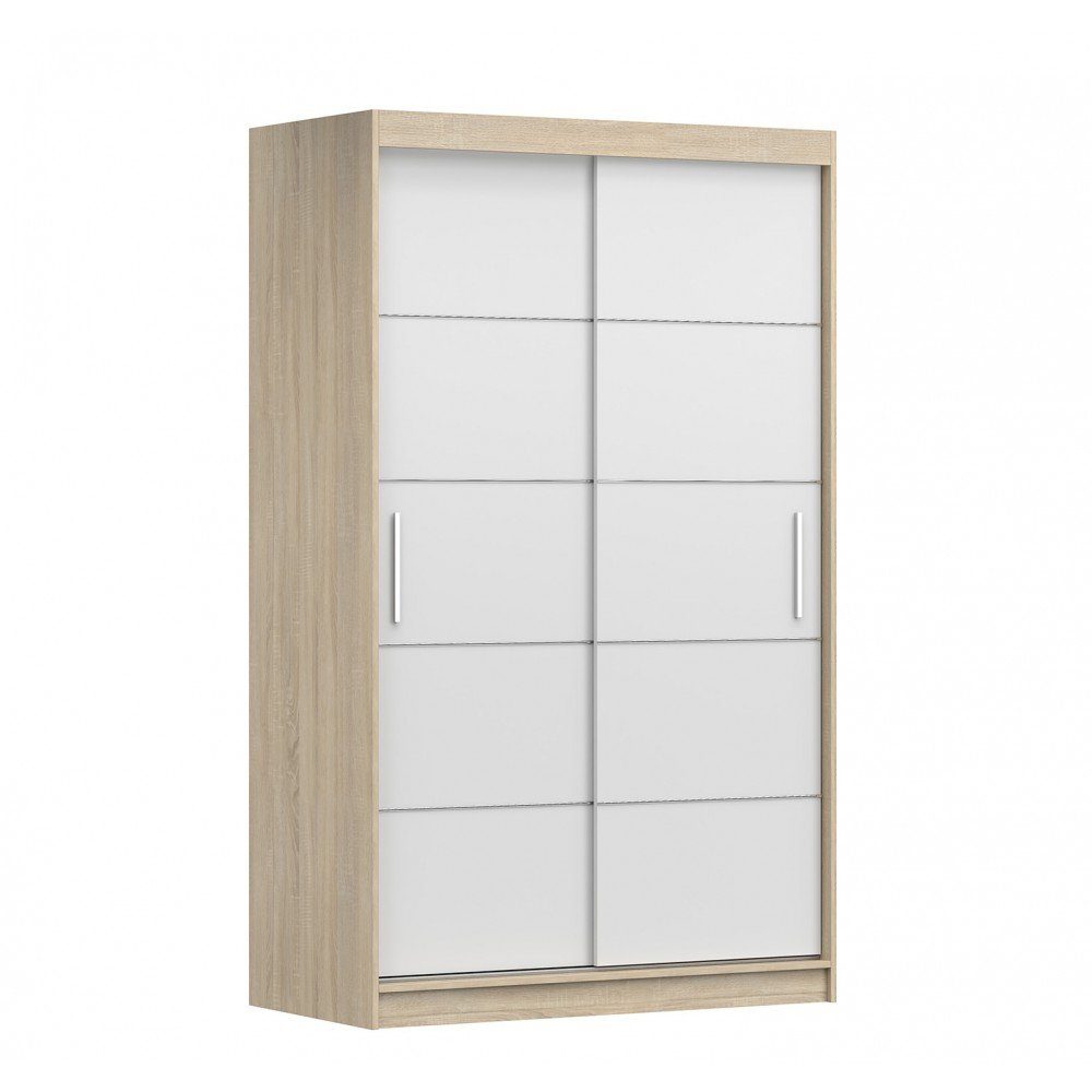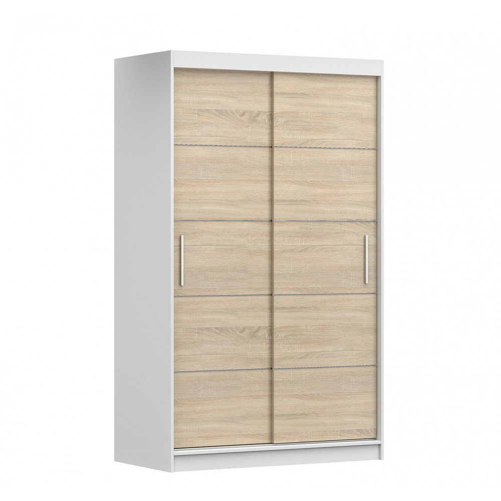 NOAH 06 ist ein verschiebbarer Kleiderschrank in modischen Farbkombinationen. Er passt ideal zu vielen Interieurs. Der Schrank verfügt über ein Schiebetürsystem, wodurch er einfach zu bedienen ist und keinen Platz wegnimmt. Er ist in zwei Teile unterteilt, die mit mehreren geräumigen Regalen und einer Stange ausgestattet sind.
