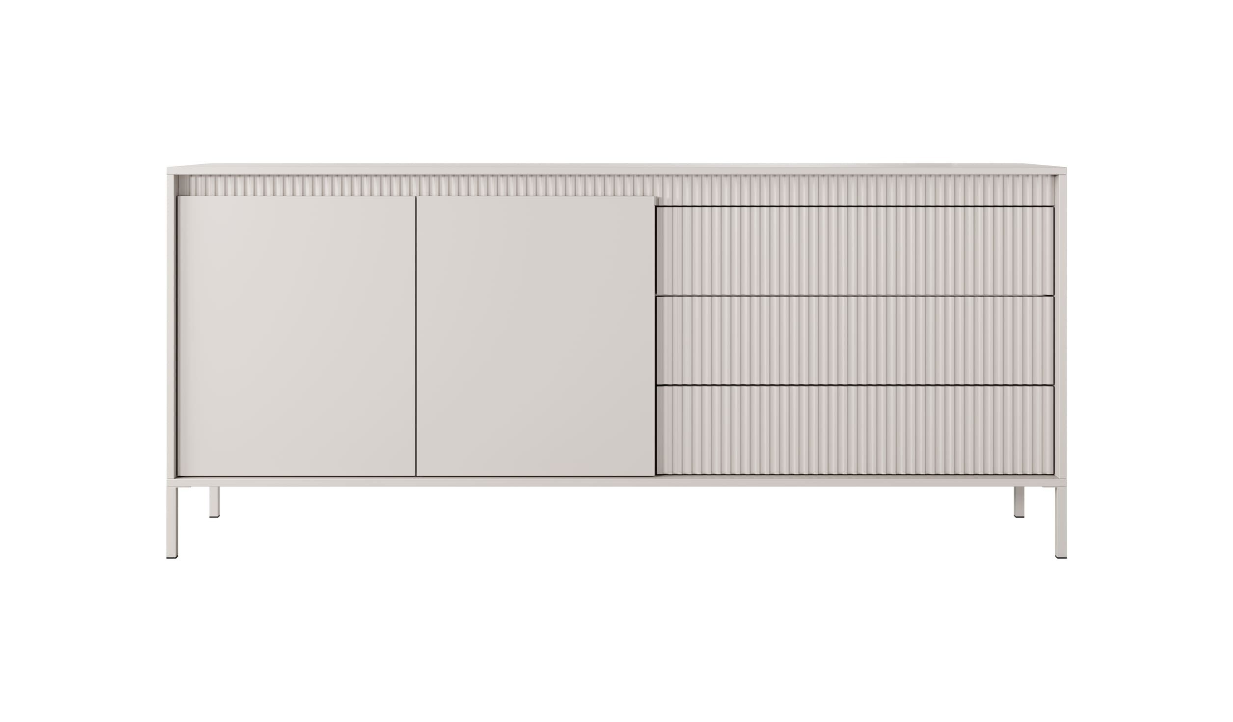 Die Rifaro-Kollektion, erhältlich in Schwarz und Beige, zeichnet sich durch ein modernes, minimalistisches Design mit einem eleganten Akzent aus. Die Verwendung von geriffelten Fronten in Kombination mit glatten, nach vorne versetzten Elementen schafft ein harmonisches Spiel von Texturen und Tiefe. Schlanke Metallbeine verleihen den Möbeln Leichtigkeit, während das grifflose Öffnen ihre klare, moderne Form betont. Schwarze Möbel bringen Eleganz und Kontrast in den Raum, während die beige Kollektion Helligkeit und Subtilität hinzufügt und so ideale Sets für zeitgemäße, stilvolle Arrangements schafft.