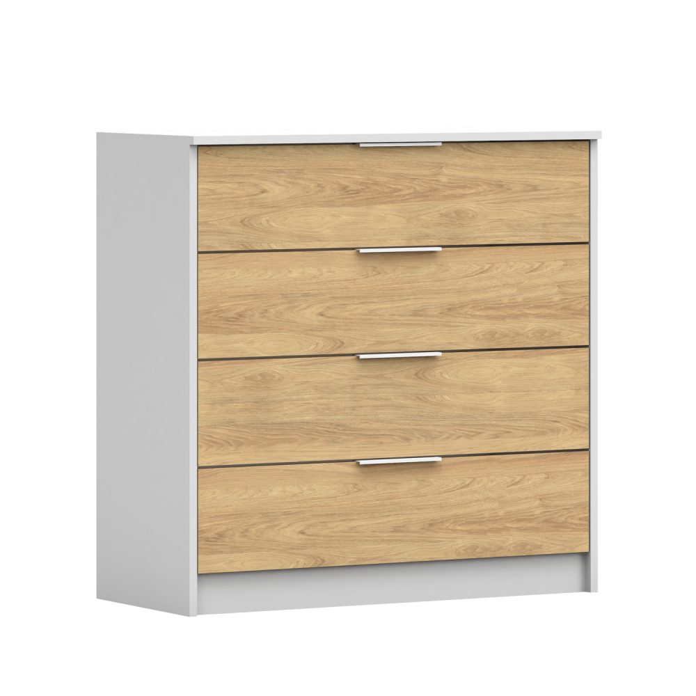 Die WETA-Kommode zeichnet sich durch ihre kompakte Bauweise aus, die es ermöglicht, sie selbst in kleineren Räumen problemlos unterzubringen. Sie bietet trotzdem ausreichend Platz in ihren vier großzügigen Schubladen, in denen Sie eine Vielzahl von praktischen Gegenständen, Kleidung oder andere persönliche Gegenstände verstauen können. Das Design dieser Kommode harmoniert besonders gut mit modernen sowie klassischen Einrichtungsstilen und lässt sich leicht in verschiedene Farb- und Dekorkonzepte integrieren.
