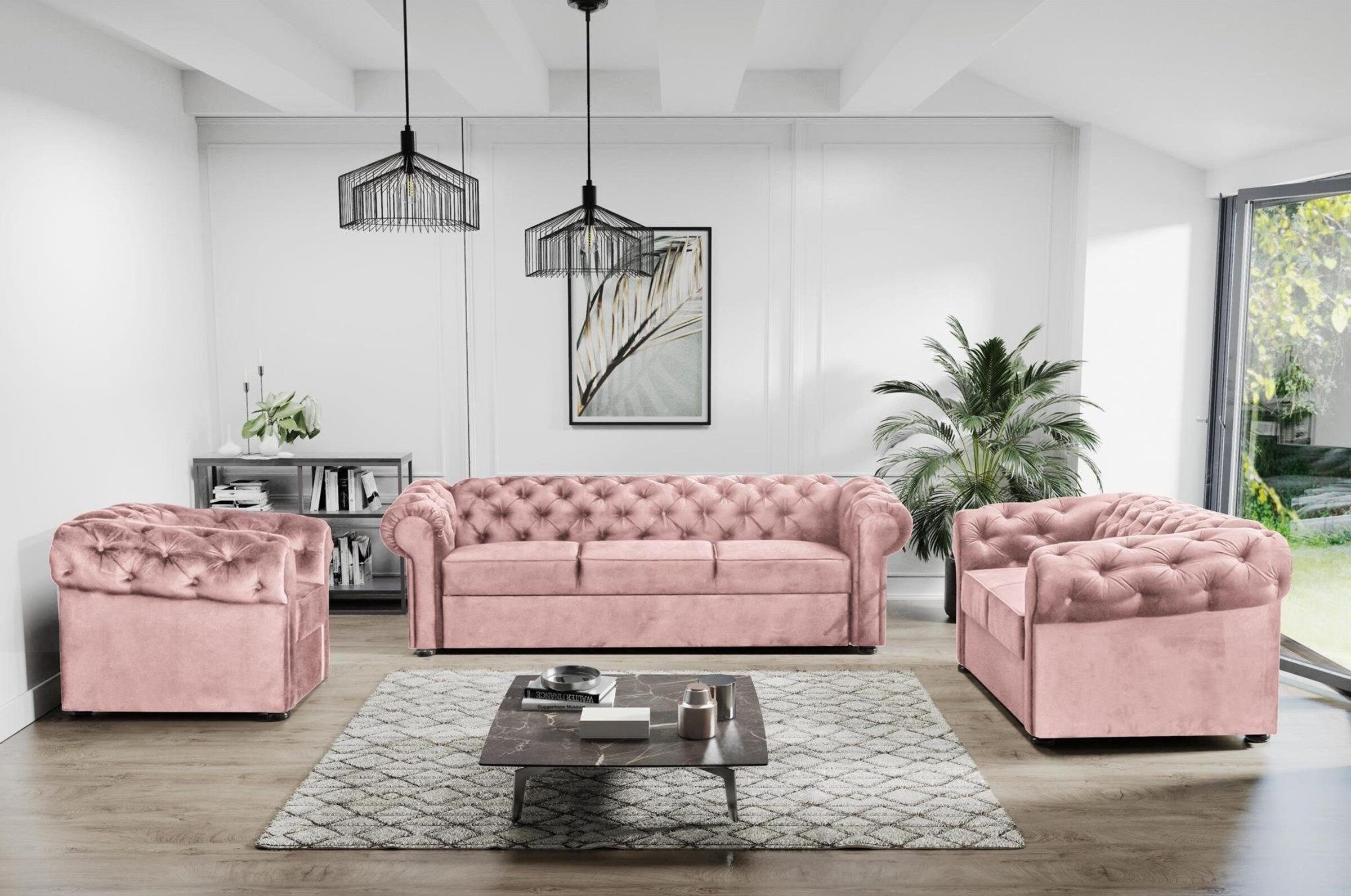 Dieses Möbelset besteht aus drei Teilen: zwei Sofas und einem Sessel in einem eleganten Puderrosa. Die Möbel sind im klassischen Chesterfield-Stil gestaltet und verfügen über eine ausgeprägte Steppung auf der Rückenlehne und den Armlehnen, was ihnen einen einzigartigen, luxuriösen Look verleiht.