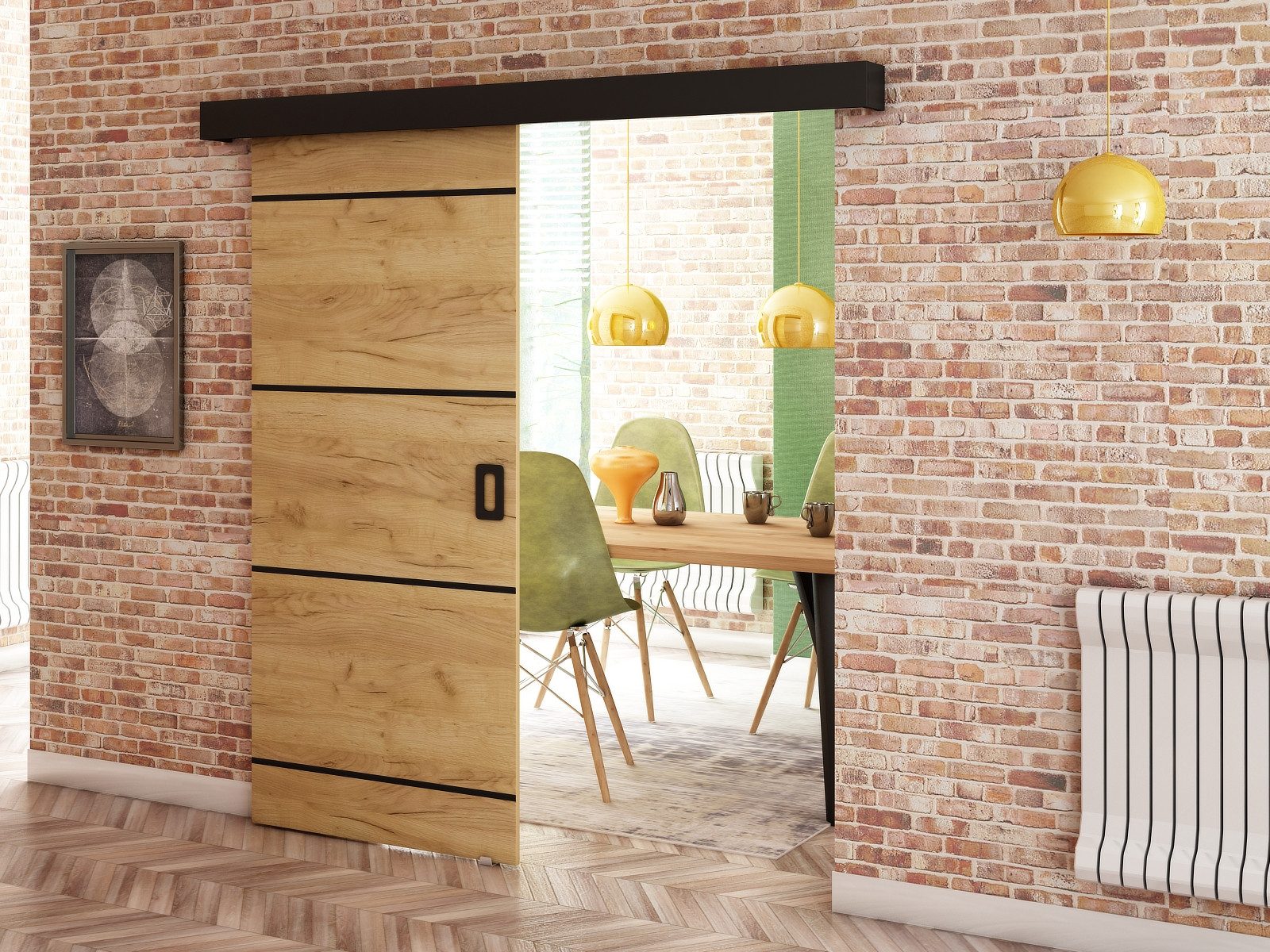 MAY-Schiebetür aus 16 mm starker laminierter Möbelplatte, Kanten sorgfältig mit haltbarem und beschädigungsbeständigem PVC-Furnier verarbeitet, Griff aus haltbarem Kunststoff.