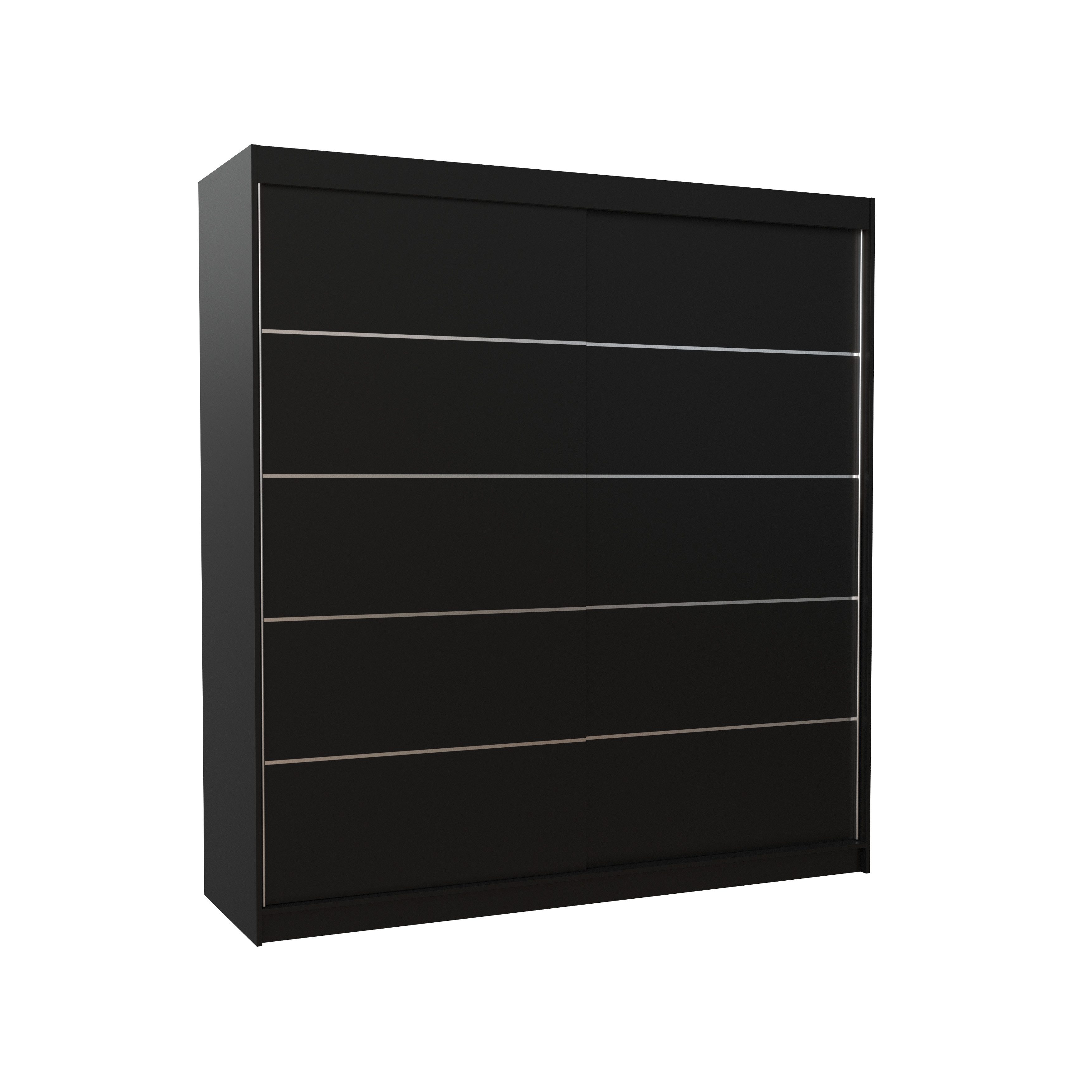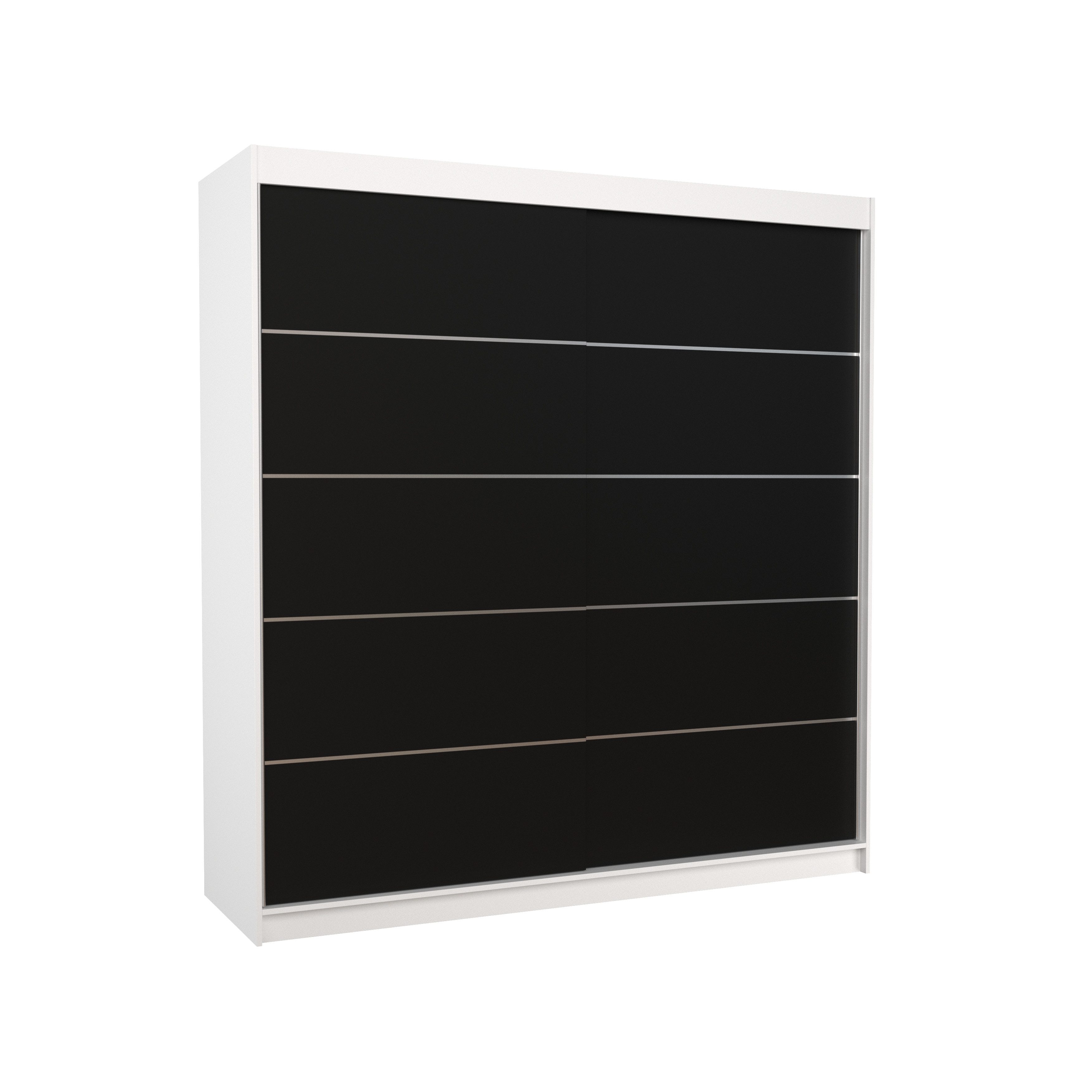 Die Front des Schranks ist mit eleganten, horizontalen Zierleisten in Silberoptik versehen, die dem Möbelstück eine moderne und raffinierte Ausstrahlung verleihen. Die Schiebetüren laufen auf hochwertigen Aluminiumschienen und benötigen keinen zusätzlichen Öffnungsbereich – ideal für kleinere Räume oder schmale Flure.
