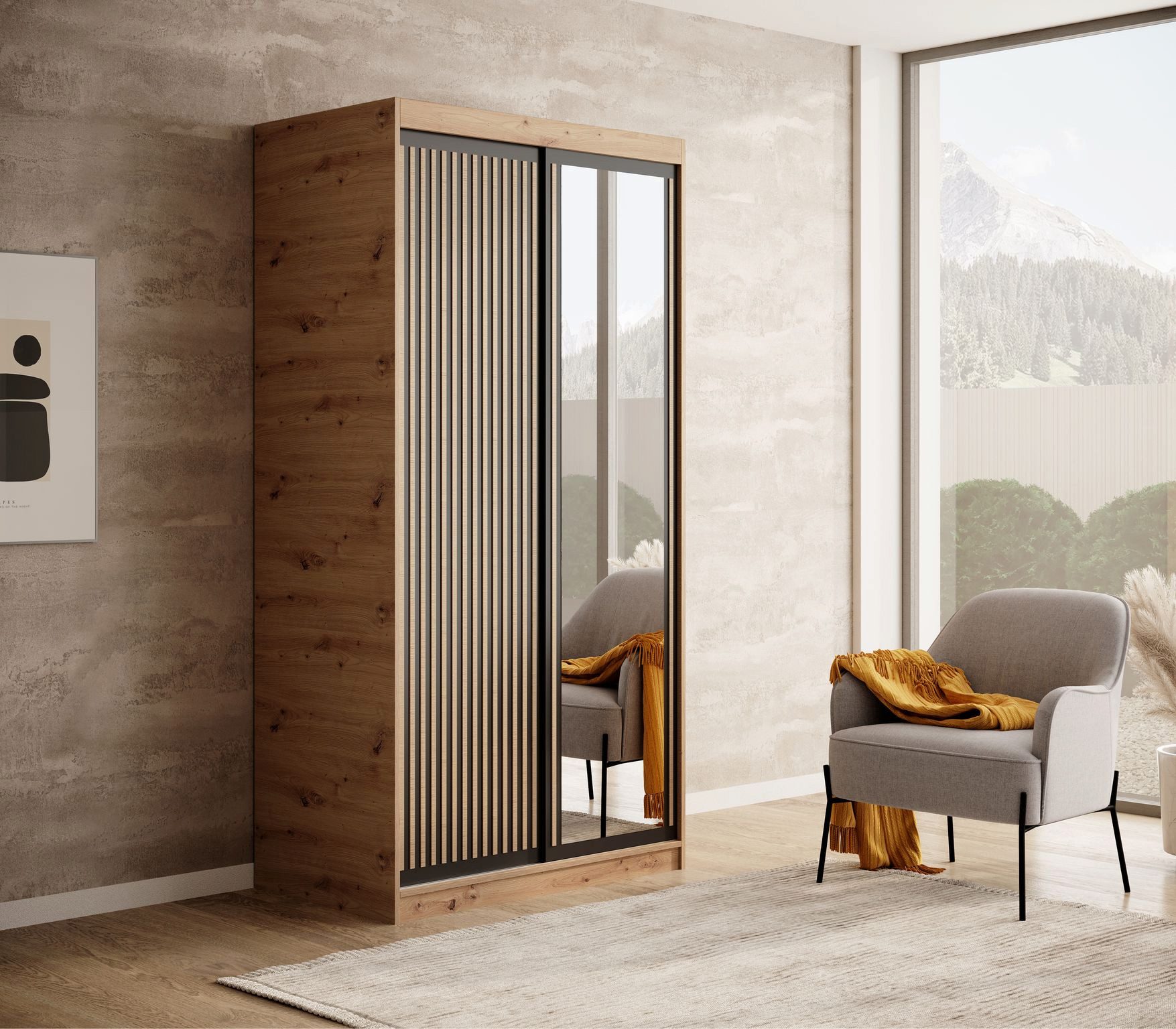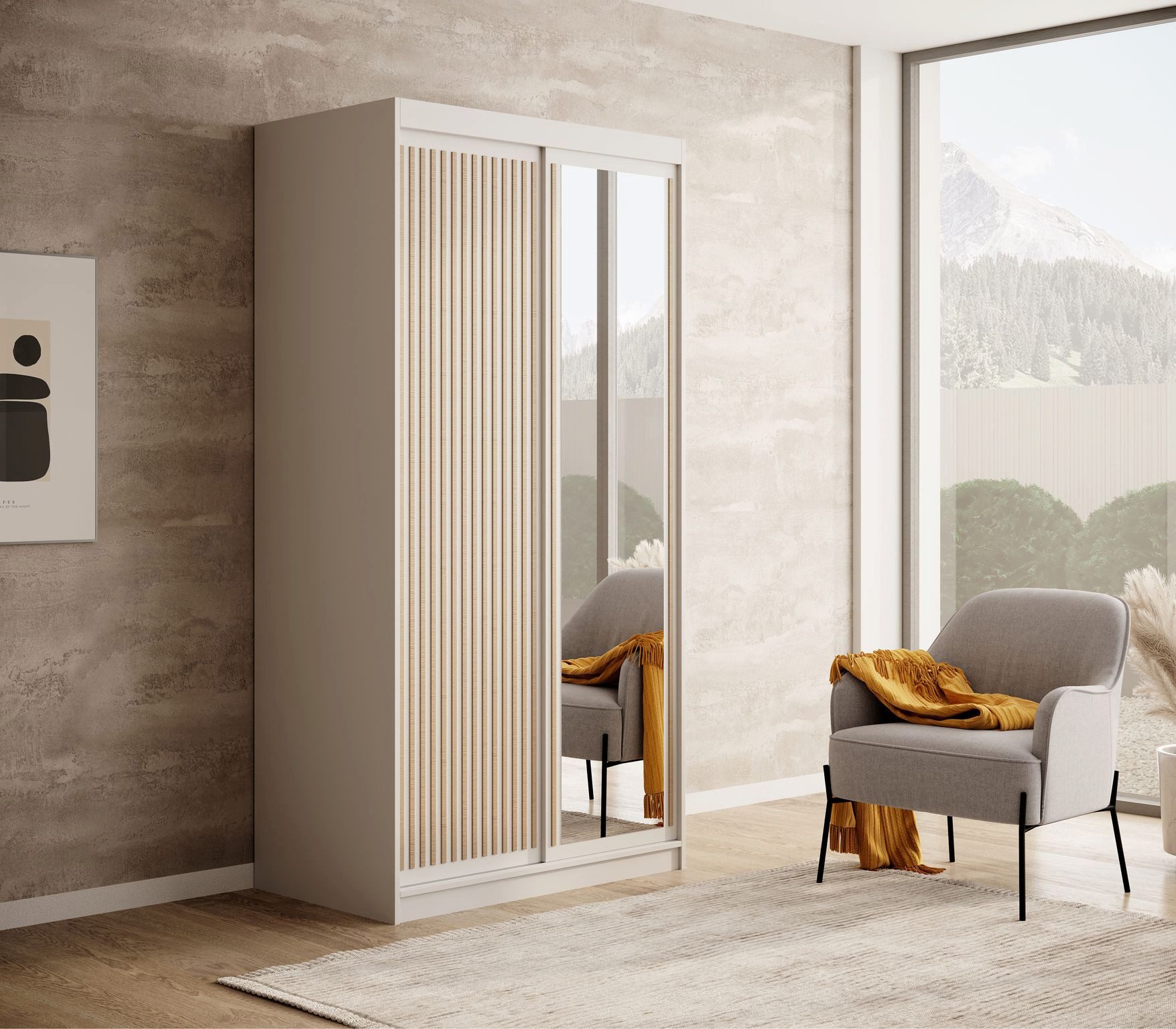 Die beiden platzsparenden Schiebetüren laufen leichtgängig auf robusten Aluminiumschienen. Ein großflächiger Spiegel auf einer der Türen verleiht dem Raum mehr Tiefe und Helligkeit. Im Inneren sorgen mehrere Einlegeböden sowie eine stabile Kleiderstange für durchdachten Stauraum – ideal für Kleidung, Schuhe oder Accessoires.