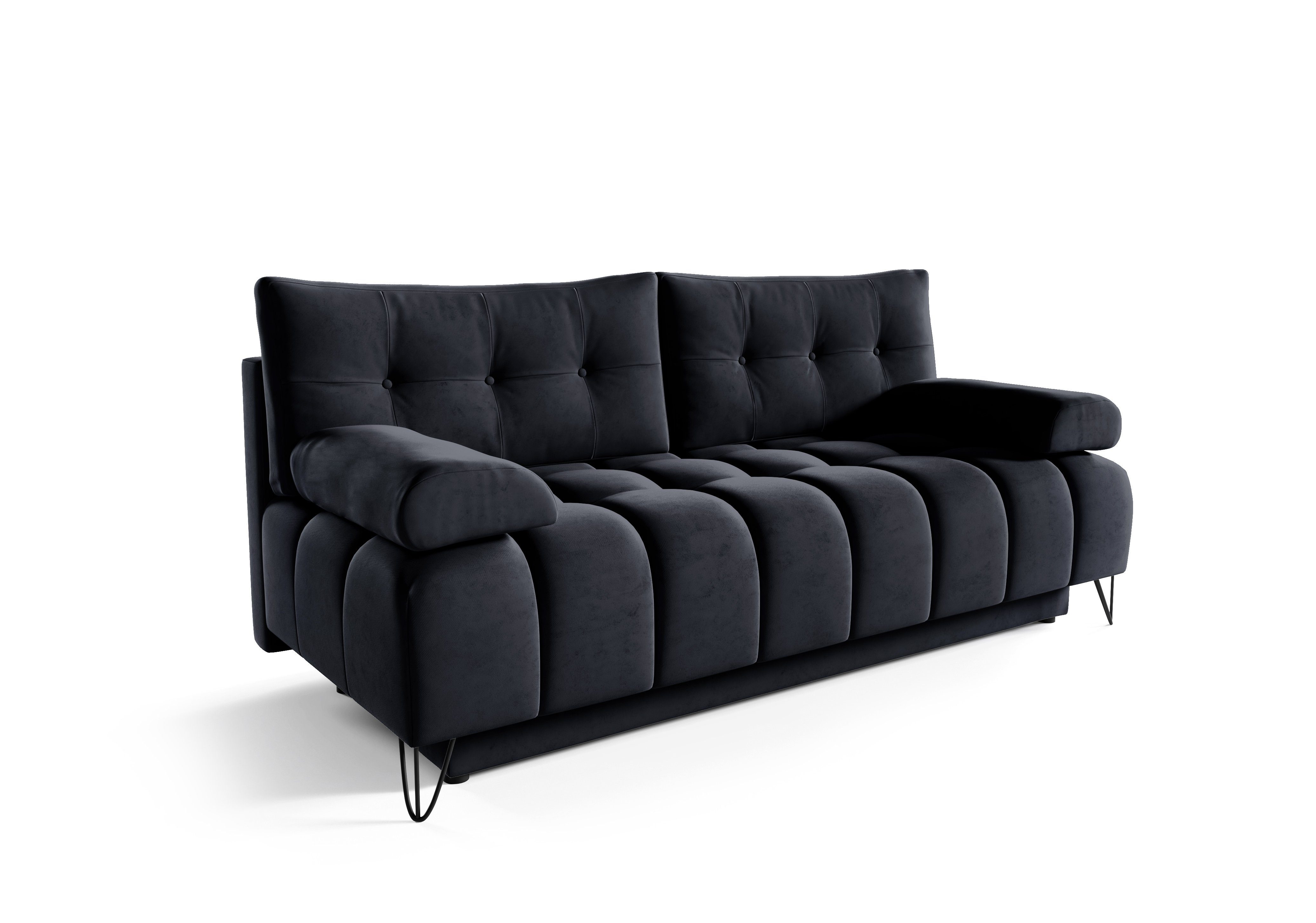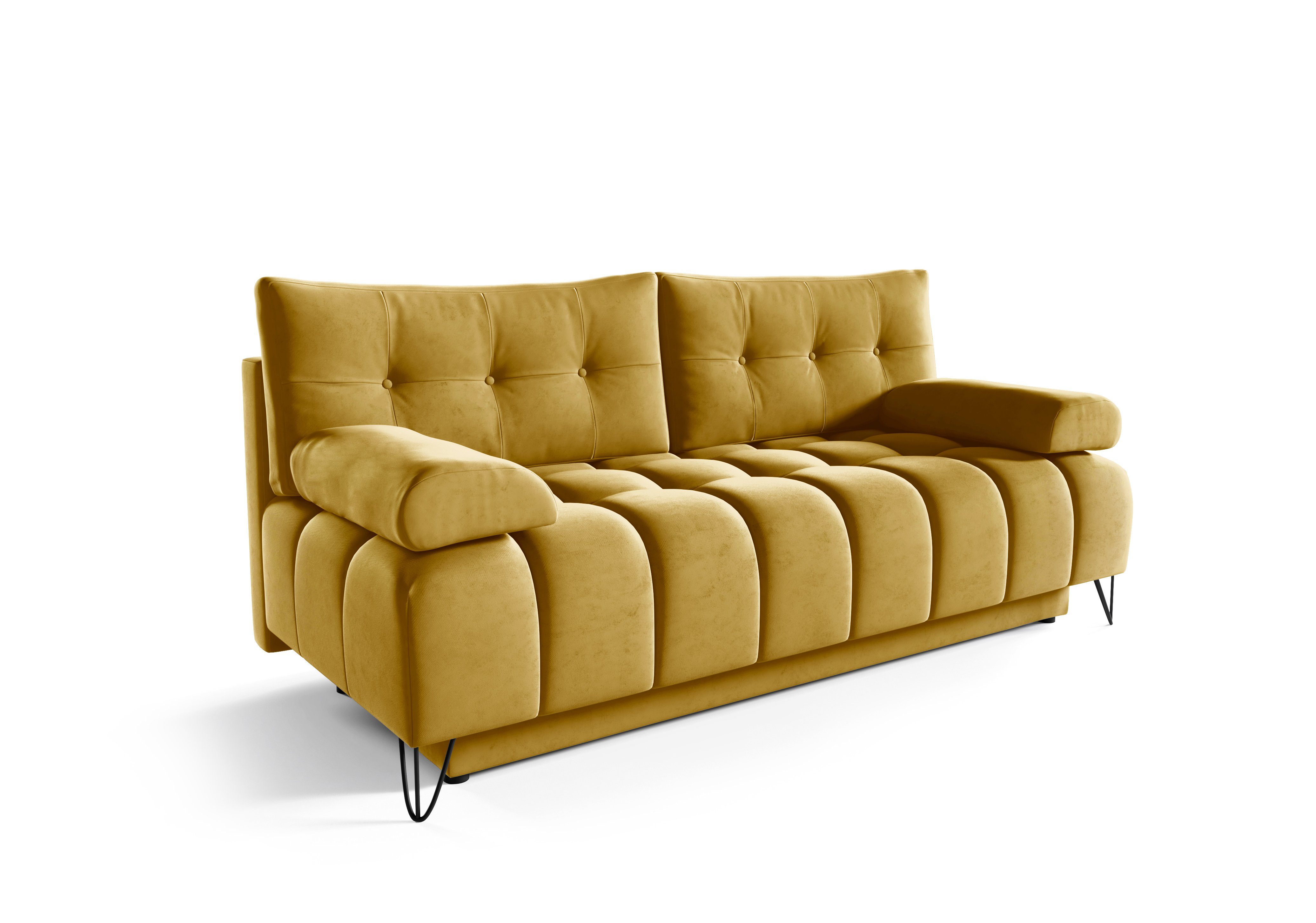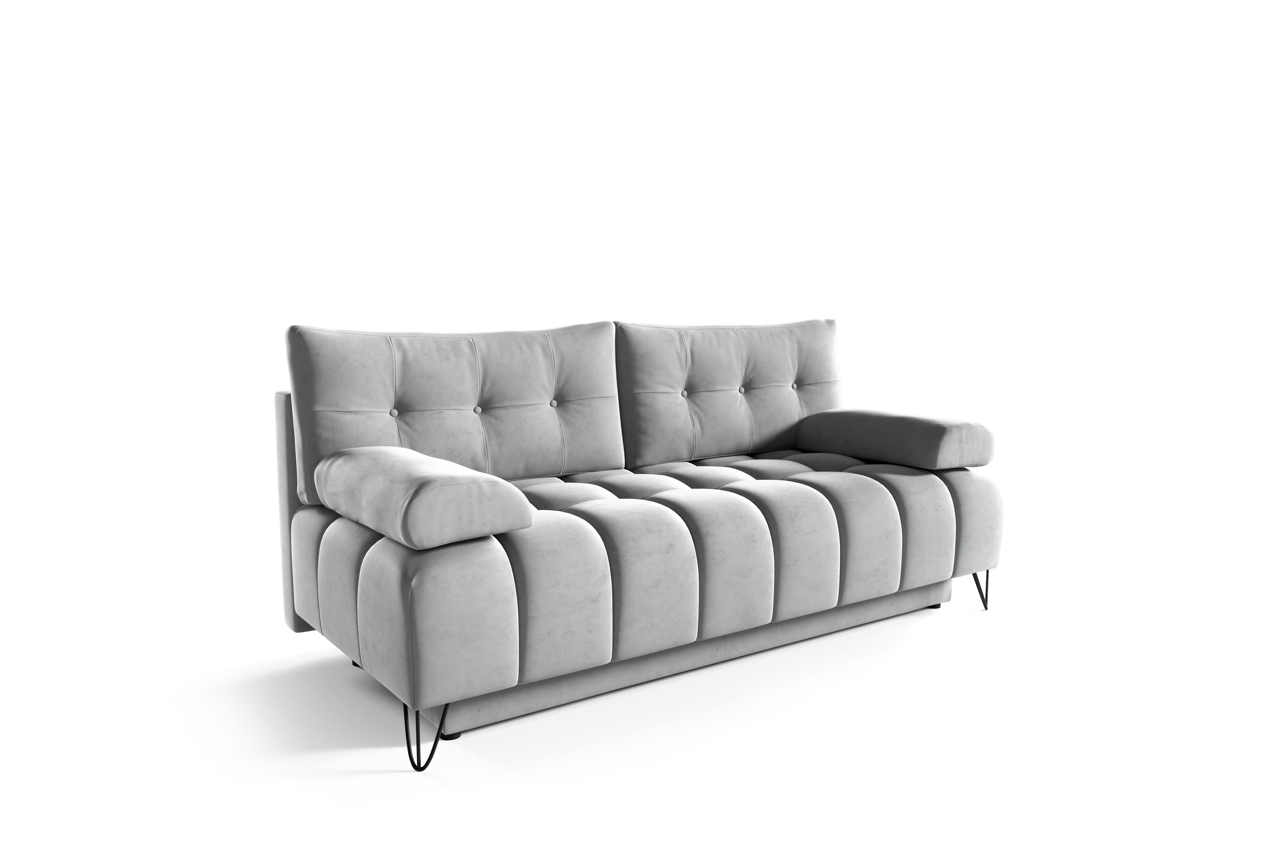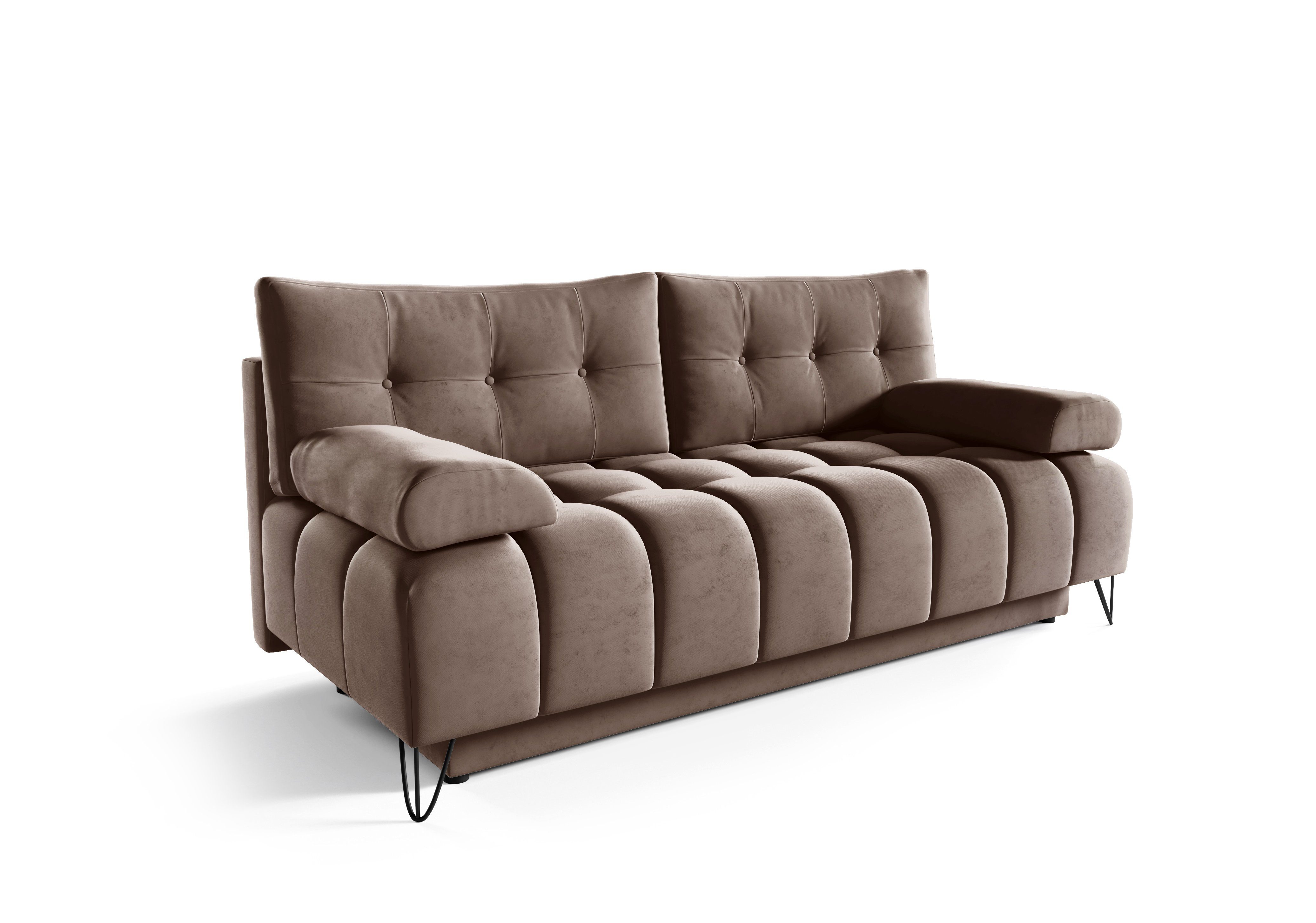 Ein Schlafsofa mit Bettkasten ist die perfekte Wahl für diejenigen, die sowohl Komfort als auch Ästhetik schätzen. Dekorative Steppungen und Nähte verleihen ihm einen einzigartigen Charakter und betonen sein elegantes Aussehen. Hohe Metallbeine verleihen nicht nur optische Leichtigkeit, sondern erleichtern auch die Reinigung unter dem Möbelstück. Dank einer breiten Farbpalette findet jeder die perfekte Option für sein Interieur. Ein so funktionales Möbelstück erleichtert das tägliche Leben und macht das Sofa zum Mittelpunkt der Entspannung in Ihrem Zuhause.
