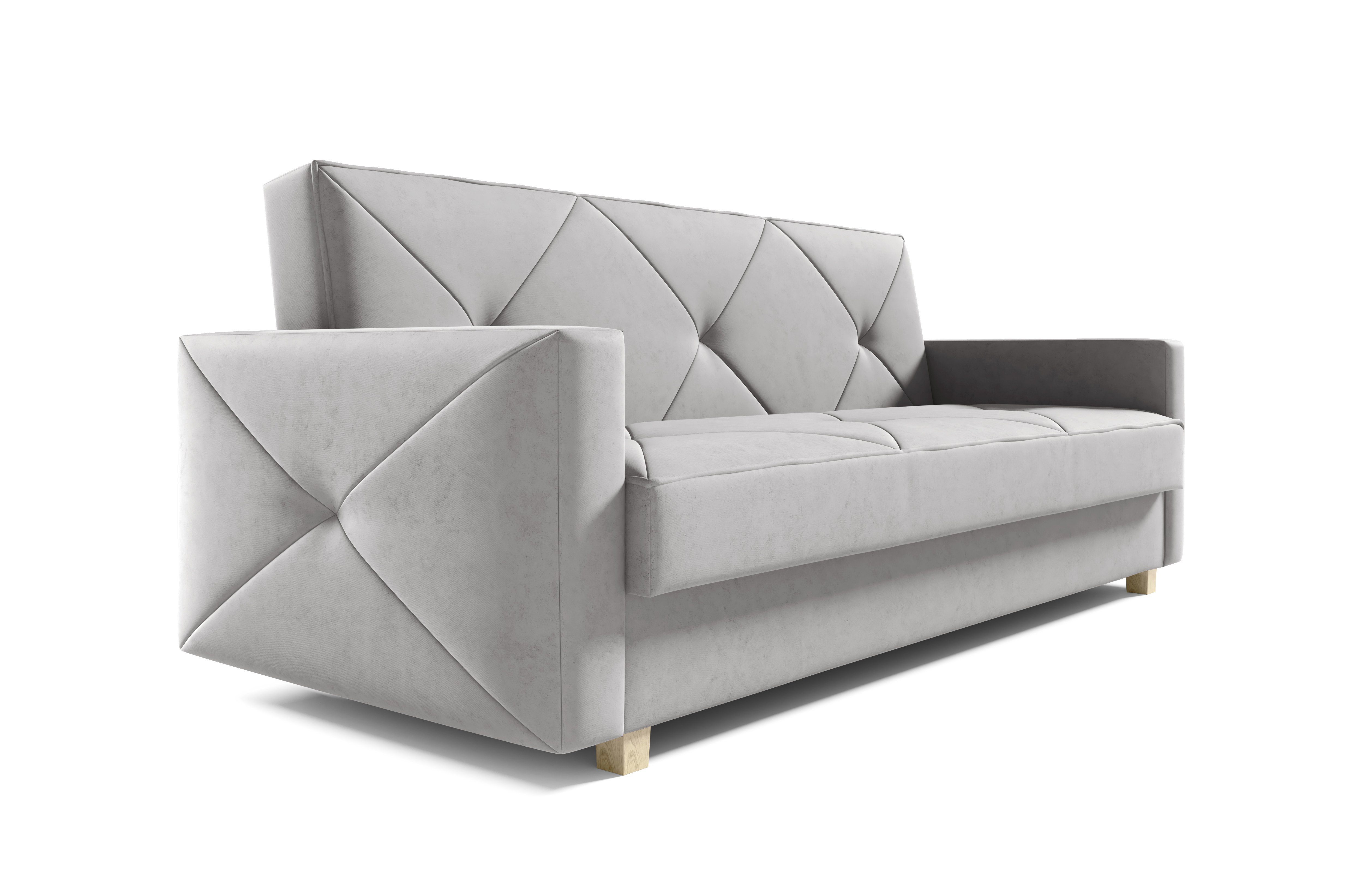 Das Sofa ist vollständig mit einem weichen und angenehmen Stoff gepolstert. Dank dieser Farbgebung lässt es sich gut mit Möbeln in allen Holztönen kombinieren. Das Sofa verfügt über einen großen Behälter für Bettzeug, zusätzliche Decken oder Kissen - das bietet zusätzlichen Stauraum.