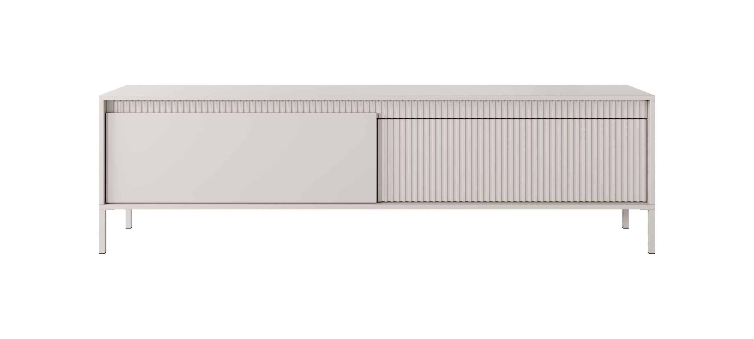 Die Rifaro-Kollektion, erhältlich in Schwarz und Beige, zeichnet sich durch ein modernes, minimalistisches Design mit einem eleganten Akzent aus. Die Verwendung von geriffelten Fronten in Kombination mit glatten, nach vorne versetzten Elementen schafft ein harmonisches Spiel von Texturen und Tiefe. Schlanke Metallbeine verleihen den Möbeln Leichtigkeit, während das grifflose Öffnen ihre klare, moderne Form betont. Schwarze Möbel bringen Eleganz und Kontrast in den Raum, während die beige Kollektion Helligkeit und Subtilität hinzufügt und so ideale Sets für zeitgemäße, stilvolle Arrangements schafft.