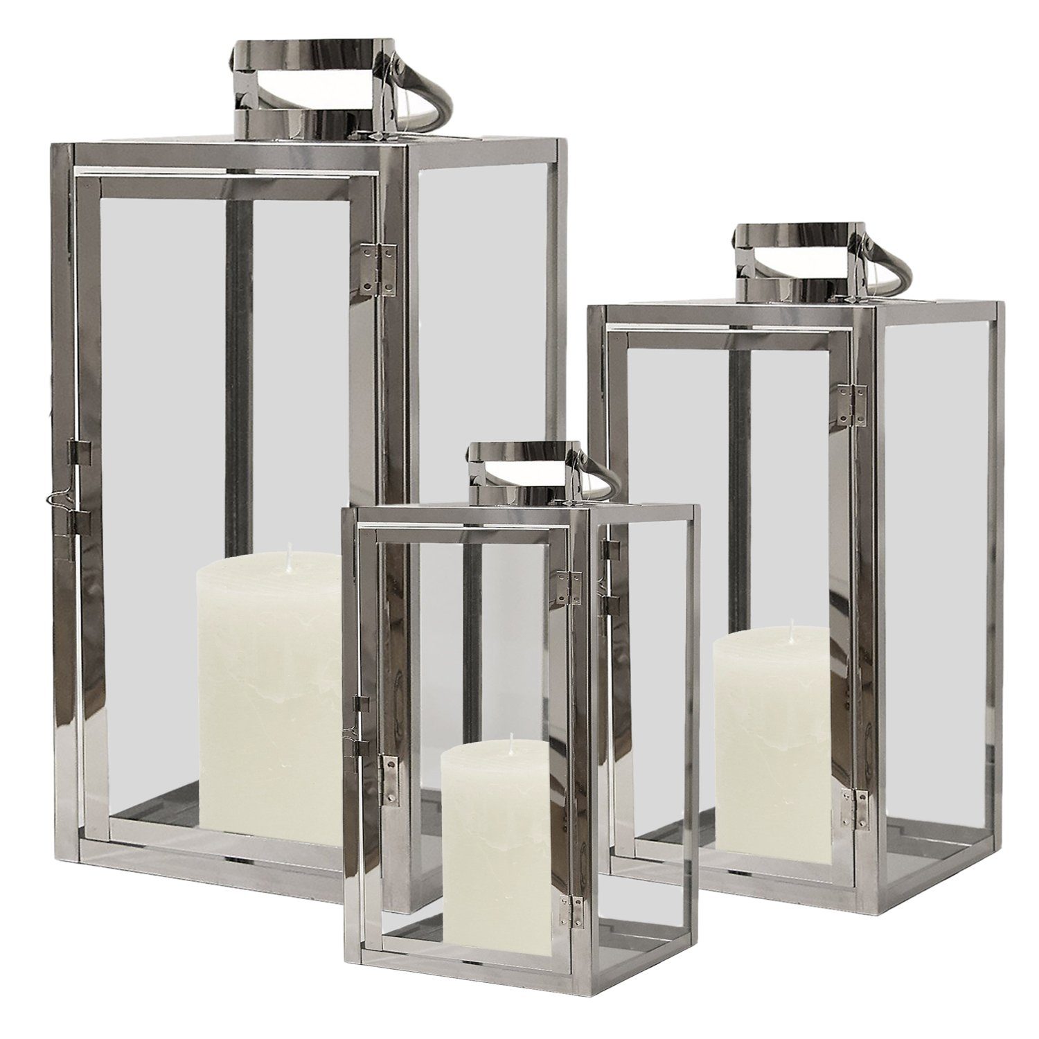 Ein modern wirkendes Laternen - Set aus Edelstahl und Glas bestehend aus drei Laternen in verschiedenen Größen 30/40/53cm.