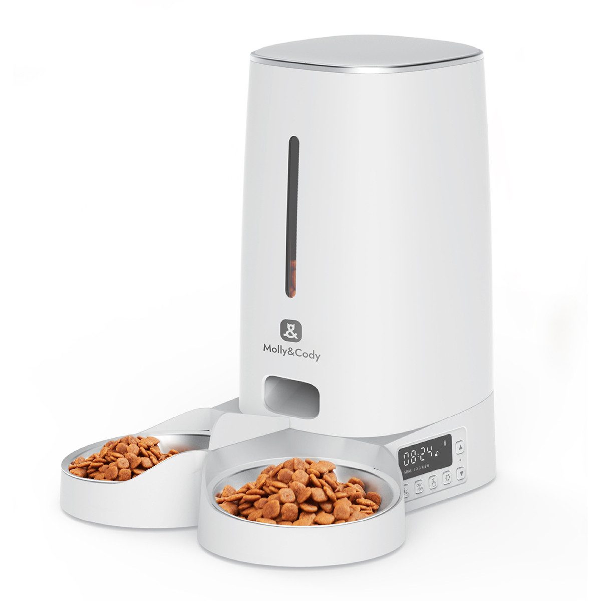 Molly&Cody LUCKY Automatischer Futterspender mit zwei Schalen bietet Ihnen die ultimative Flexibilität und Bequemlichkeit für die Fütterung Ihrer geliebten Haustiere. Mit zwei Schüsseln können Sie verschiedene Fütterungsbedürfnisse erfüllen oder sogar zusätzliche Mahlzeiten für Ihre Haustiere planen. Dank der automatischen Fütterungsfunktion können Sie sicher sein, dass Ihr Haustier stets pünktlich und mit der richtigen Menge gefüttert wird. Der spezielle Trocknungsmittelbeutel hält das Futter länger frisch und schmackhaft, damit Ihr Haustier jede Mahlzeit genießen kann. Die abnehmbaren Teile machen es besonders einfach, den Futterspender zu reinigen, sodass Sie mehr Zeit mit Ihren vierbeinigen Freunden verbringen können.