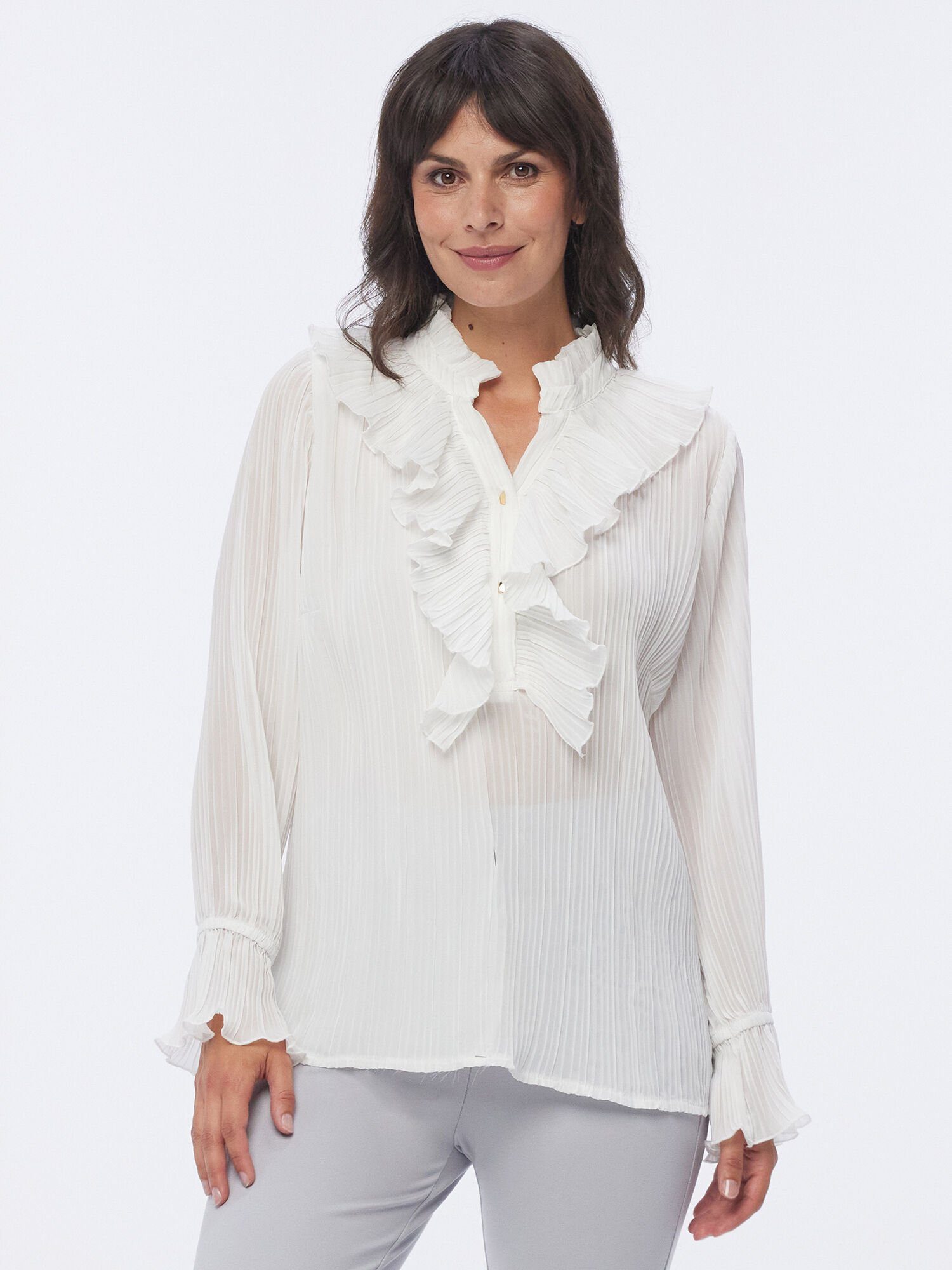Die MONACO BLUE Plissee-Rüschenbluse in strahlendem Weiß ist ein Inbegriff von Eleganz und Stil. Die goldfarbenen Knöpfe an dieser Bluse sind elegante Akzente, die nicht nur funktionell sind, sondern auch Ihren Look aufwerten. Sie verleihen der Bluse eine luxuriöse Note. Der einzigartige Ausschnitt dieser Bluse setzt einen besonderen Akzent. Er verleiht Ihrem Outfit eine raffinierte Note und zieht die Blicke auf sich. Diese Plissee-Rüschenbluse ist ein zeitloses Kleidungsstück, das sich perfekt für verschiedene Anlässe eignet. Sie können sie im Büro, bei festlichen Veranstaltungen oder in Ihrer Freizeit tragen und sich immer stilvoll fühlen.