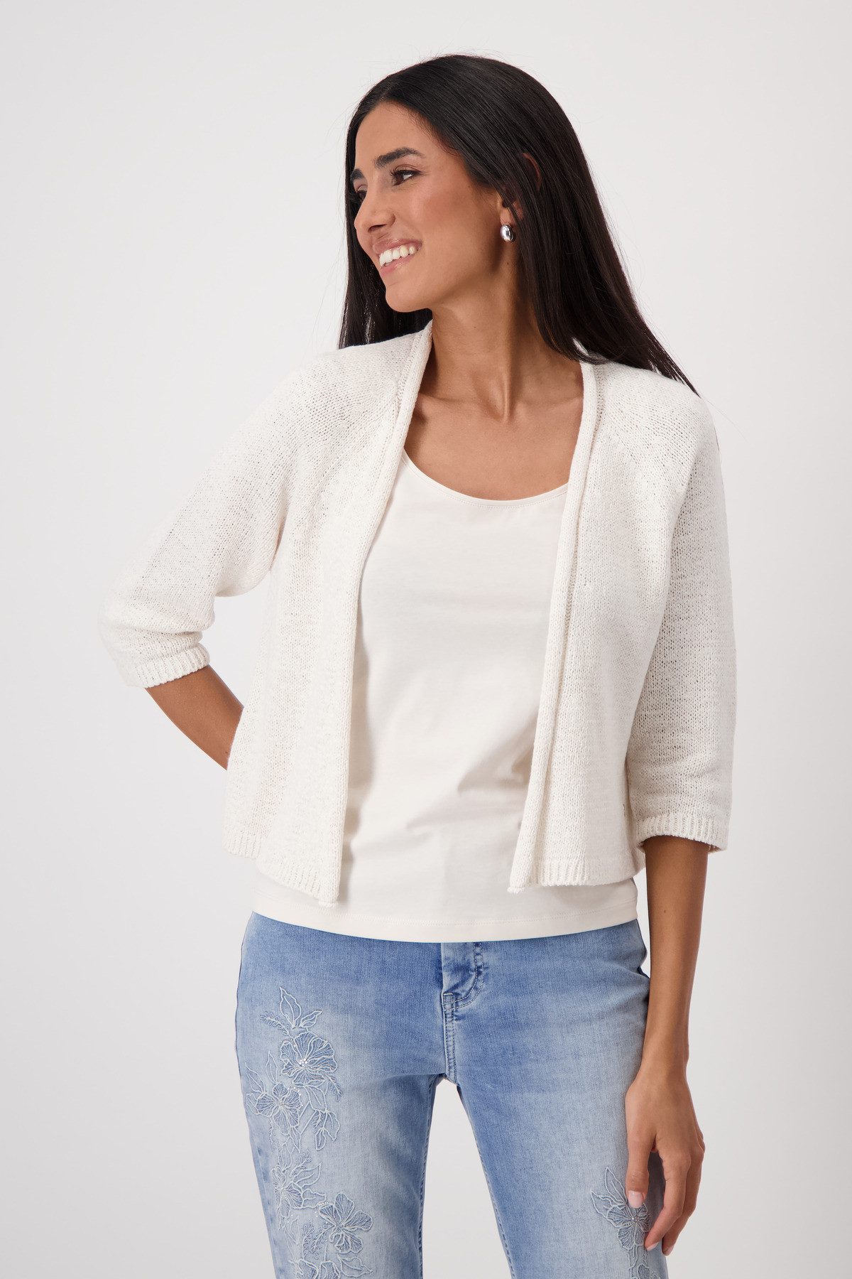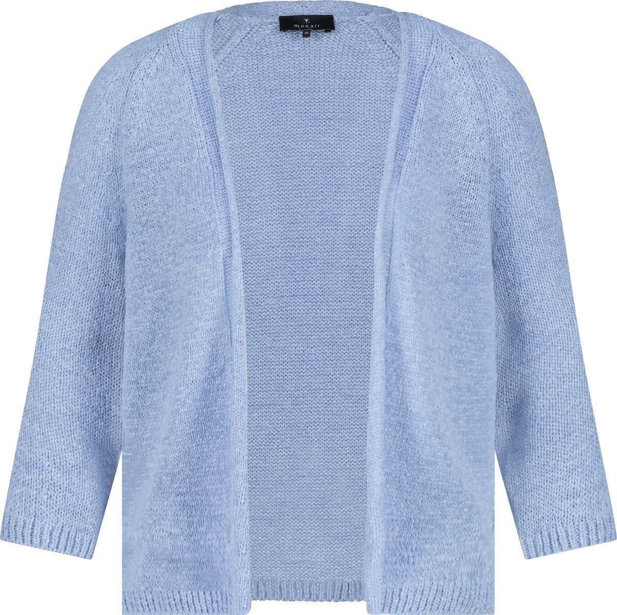 Mit der Strickjacke von Monari kaufst du dein zukünftiges Lieblingsteil. Sie kann ohne Verschluss schnell übergezogen und lässig offen getragen werden. Die 3/4-Ärmel schließen mit einem Rippstrickbündchen ab. Dadurch passen sie sich deinem Handgelenk an. Die Strickjacke ist kurz und gerade geschnitten, so fühlst du dich rundum wohl in deinem Outfit.